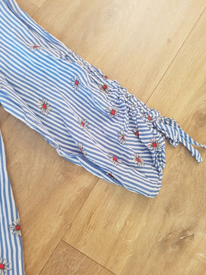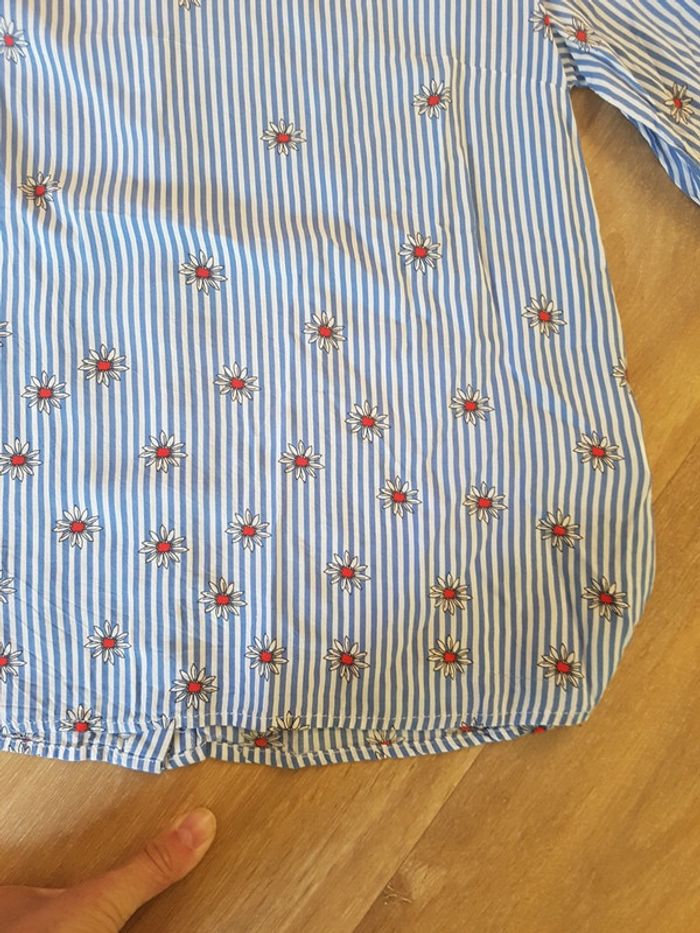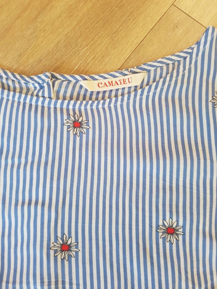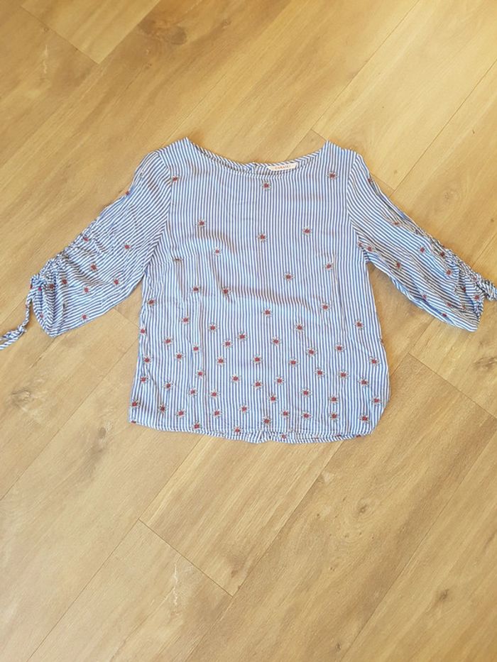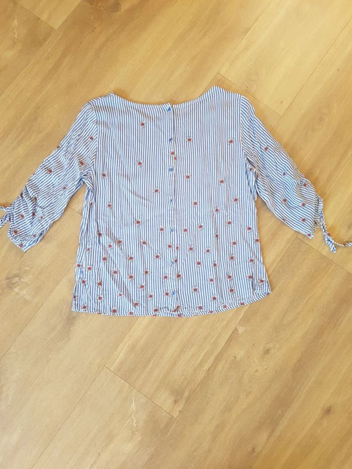 Joli haut Camaïeu manches 3/4, taille 34 Rayures bleues et blanches avec petites fleurs rouges Boutonnière dans le dos