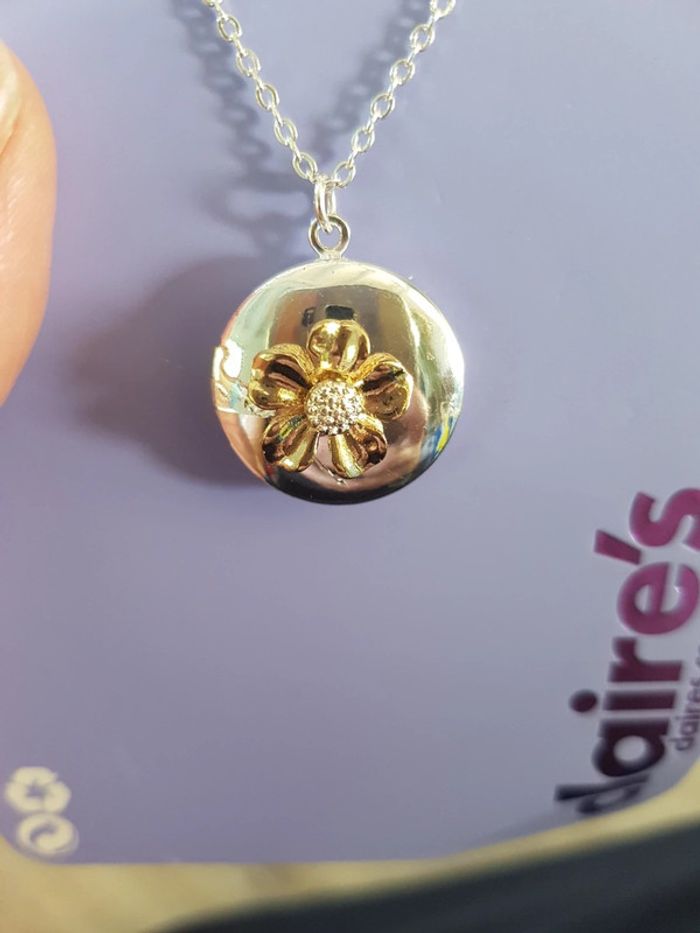 Collier médaillon Claire's argenté avec pétales dorés et brillants au cœur de la fleur. S'ouvre pour mettre photo ou autre! Valeur 15,99€ #aline_38_bijoux