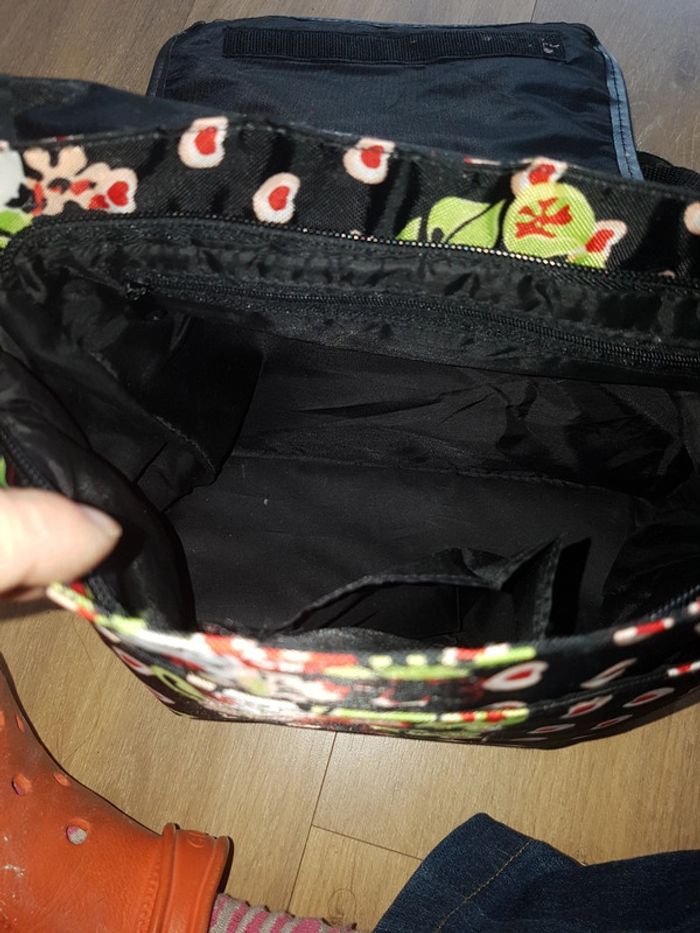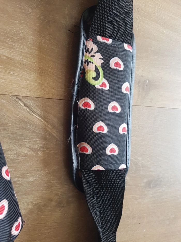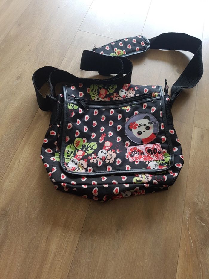 Adorable sac bandoulière Panda Pin Wo, avec plusieurs poches... Il est en excellent état, juste la protection de la bandoulière à été cousue trop prêt du bord du tissu, et le couture n'a pas tenue, voir dernière photo