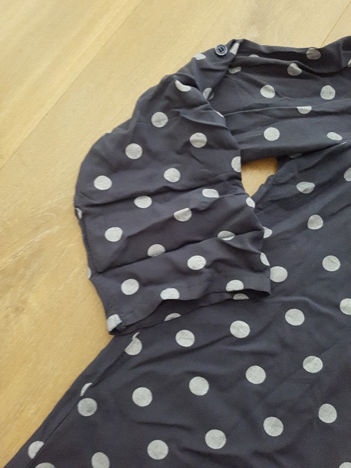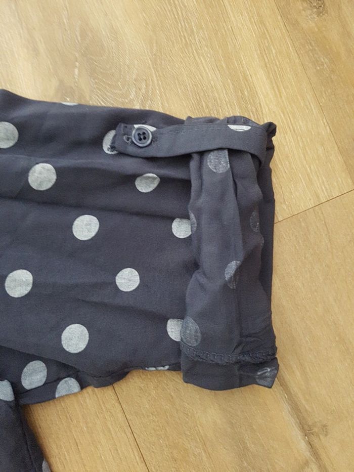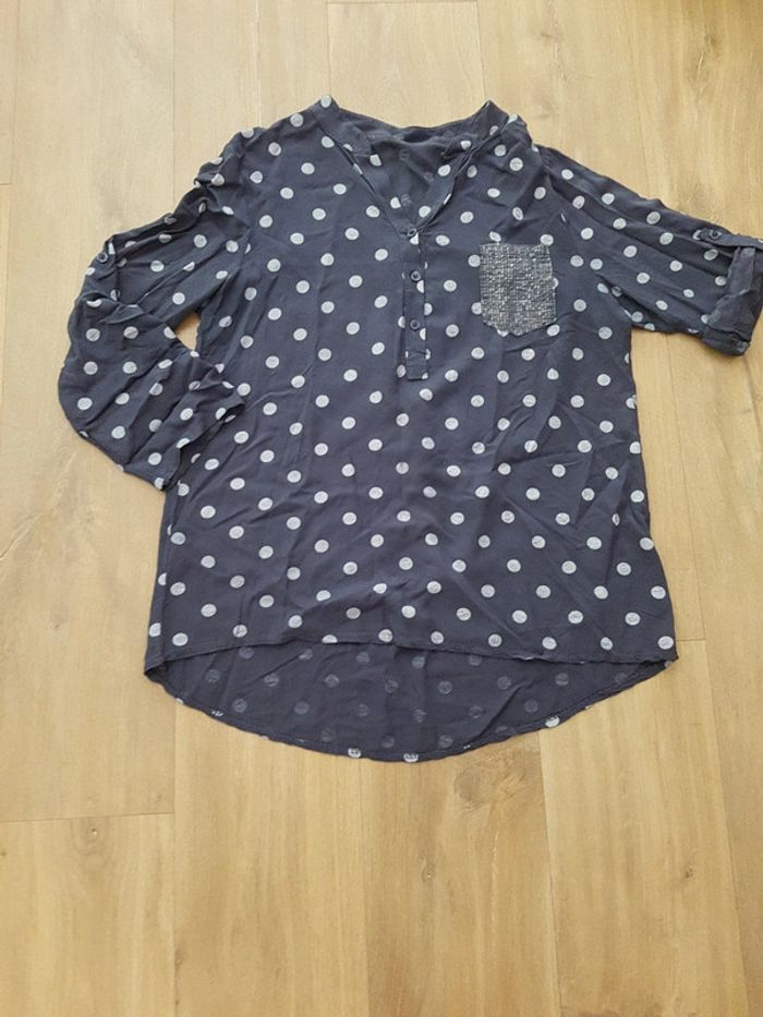 Joli chemisier gris à pois blancs (made in Italy) Il manque quelques brillants sur le poche poitrine Pas d'étiquette de marque et celle de taille n'est plus lisible. Correspond à un M pour un porte un peu ample (n'hésitez pas à me demander les mesures ou photo porté!)