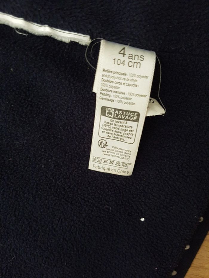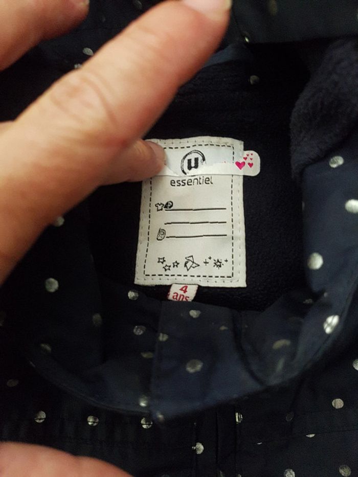Veste de pluie U essentiel, taille 4 ans, doublure polaire (sauf manches doublure standard) Bleu marine avec des pois argentés (effacé à certains endroits)