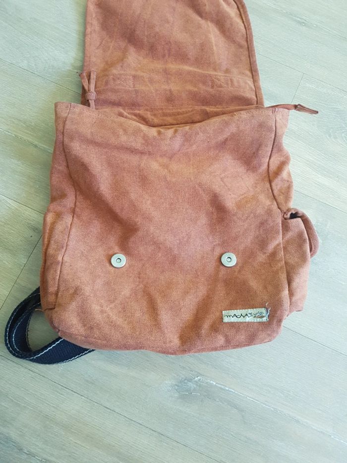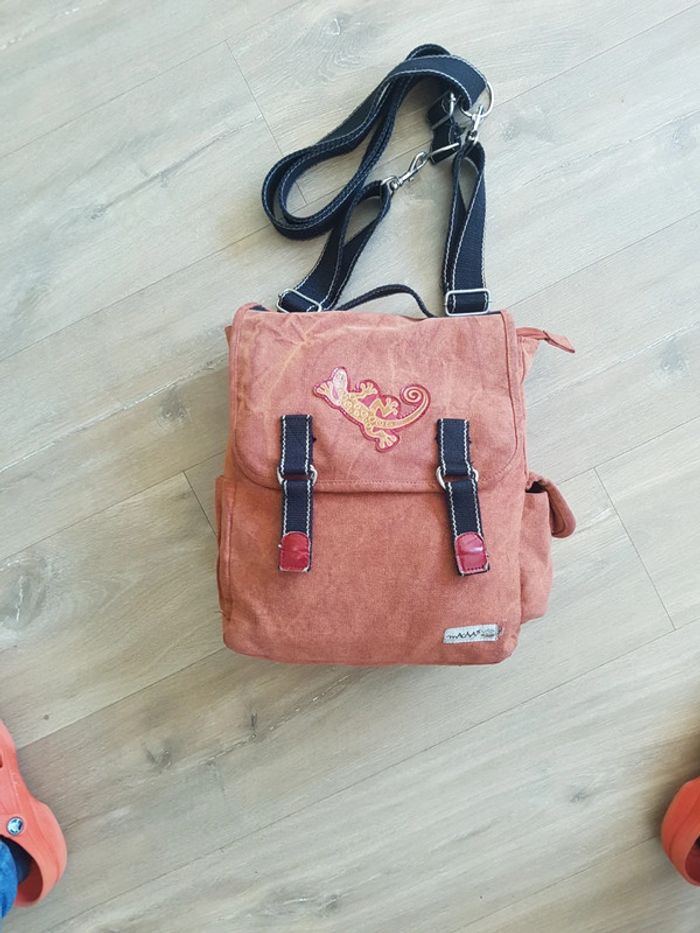 Sac bandoulière Macha Mt., en tissu marron orangé, avec salamandre sur le devant La bandoulière est réglable