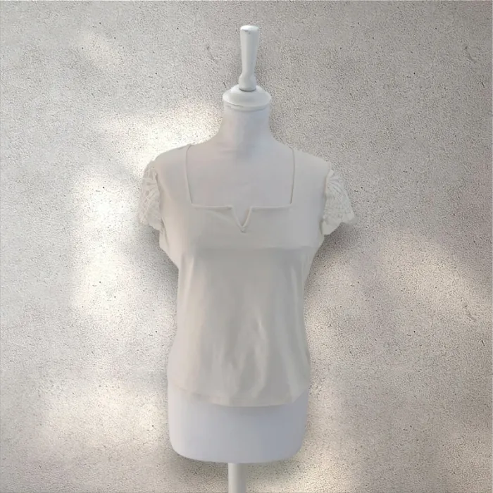 🚀 Envoi rapide et soigné ✨️Réductions sur les lots possible ➡️ Nombreux articles dans cette taille n'hésitez pas à parcourir toute la boutique pour faire un lot.🤗 T-shirt manches courtes brodées blanc avec joli décolleté, agréable à porter, taille M. #tshirtfemme #tshirtmanchescourtes38 #tshirtmanchescourtesblanc #tshirtmanchesbrodees #tshirtbroderieblanche38 #manchesbrodees #envoirapideetsoigné #reductionsurleslots #envoirapide #envoisoigné S9