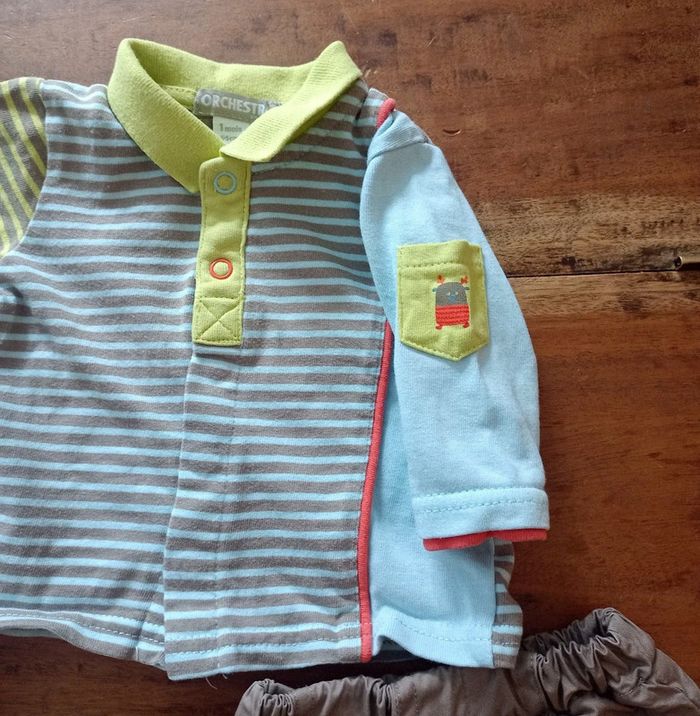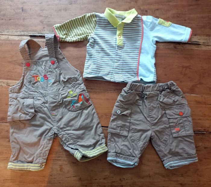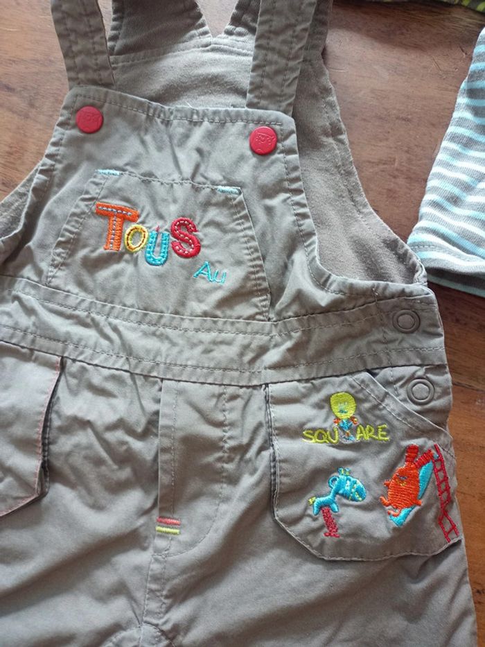 Ensemble Orchestra 1 mois, une salopette, un pantalon et un t-shirt ouverture devant