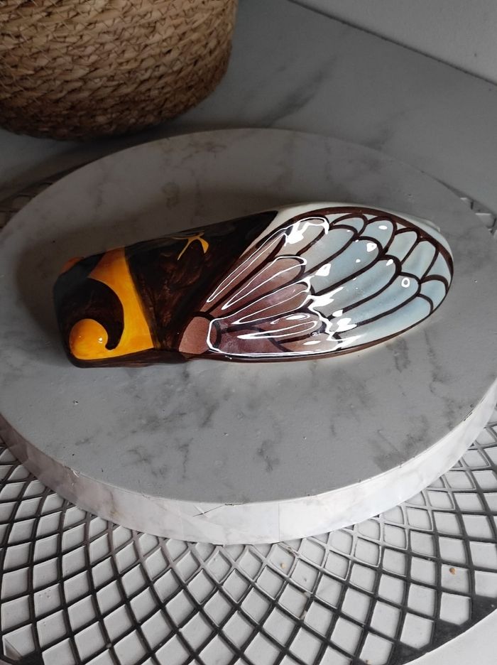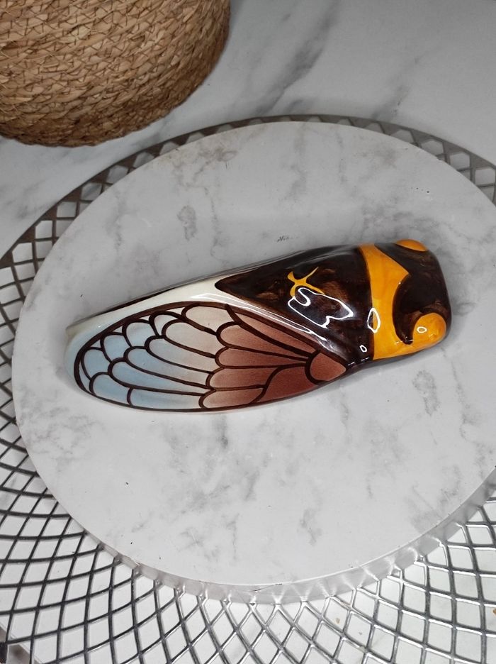 Magnifique cigale décorative murale en céramique vernis. Elle apportera une touche de nature et de couleur à votre intérieur. Cette cigale est fabriquée en céramique de haute qualité. Ses motifs colorés et ses détails sculptés en font une pièce unique et artisanale. Elle peut être accrochée au mur pour une décoration originale. L'objet est en très bon état, sans aucun dommage visible. Il a été soigneusement conservé et est prêt à être exposé dans votre maison. Dimensions H 19 x L 8 cm