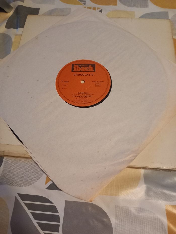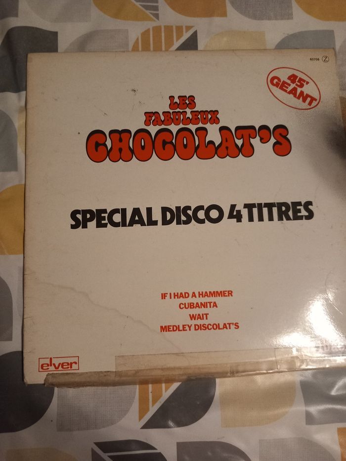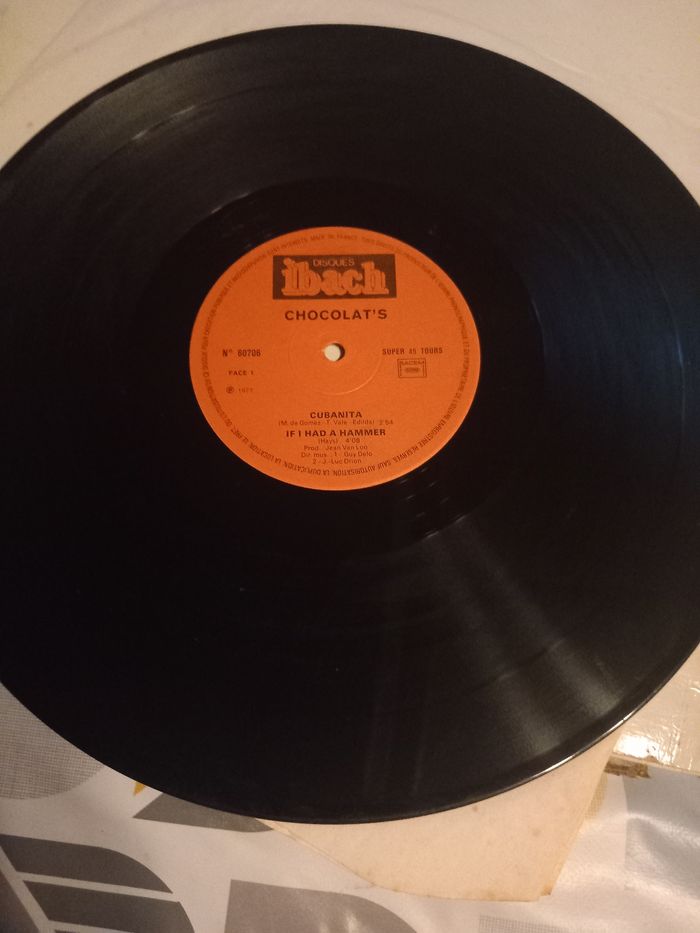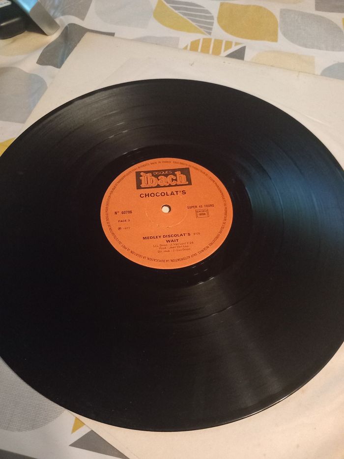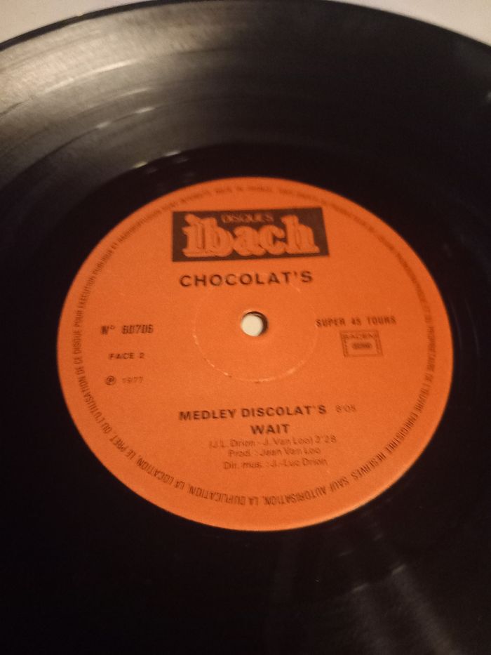 Disque vinyle 33 tours Artiste : Chocolat's Titre : spécial disco Face A 2 titres Face B 2 titres En bon état juste la pochette abîmer voir photos
