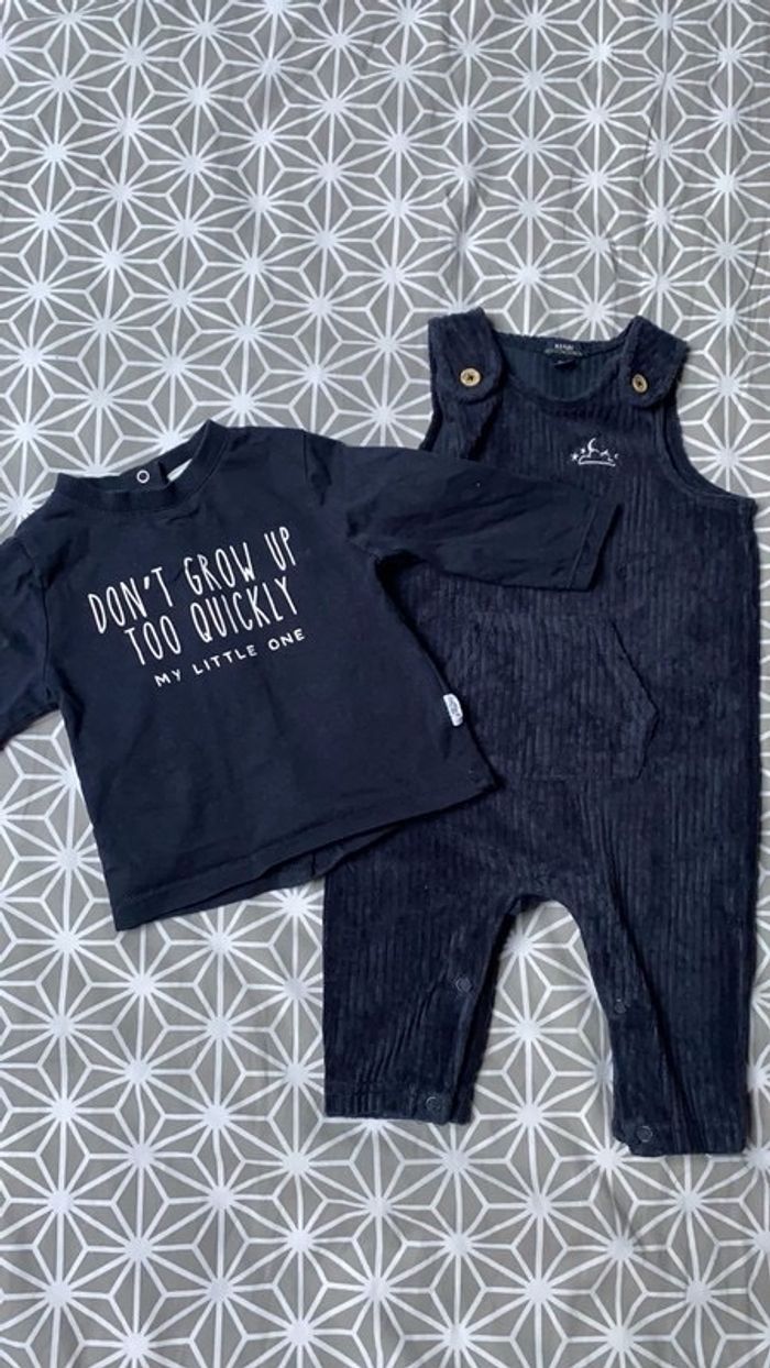 Ensemble salopette et tee-shirt manche longue en coton. Porté 1 fois