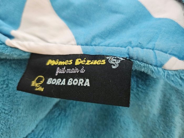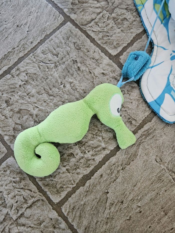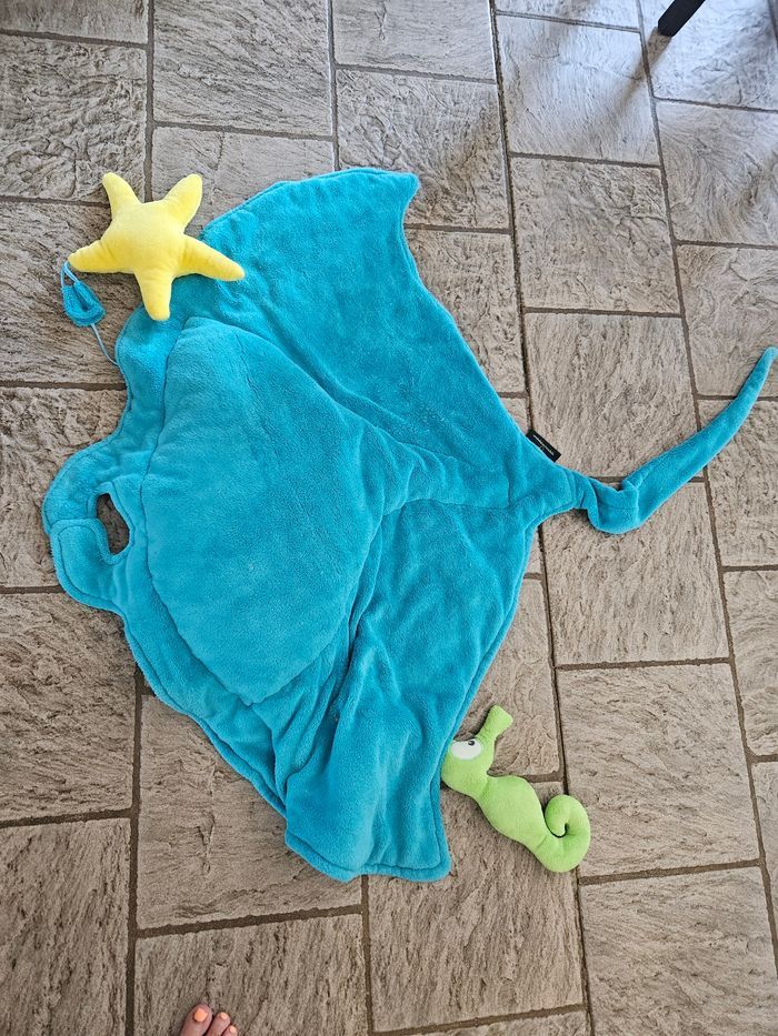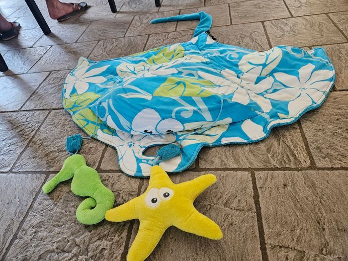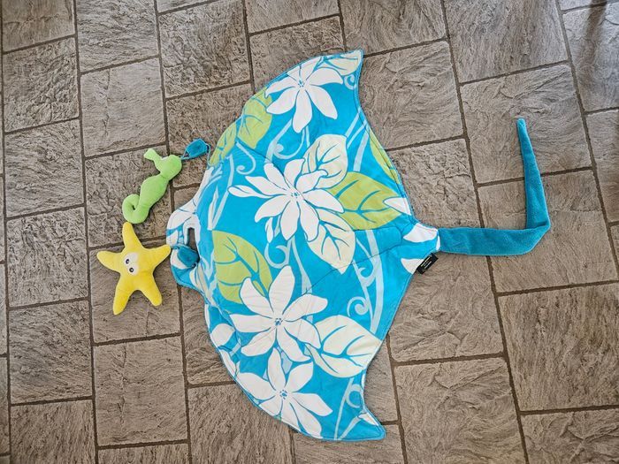 Tapis d'éveil en tissu en forme de raie manta entièrement lavable. Fait main à Bora Bora de la marque Mômes Deziles. Très confortable avec le coussin intégré dans la tête de la raie. Deux jouets d'éveil différents (bruit et texture) sont détachables du tapis.