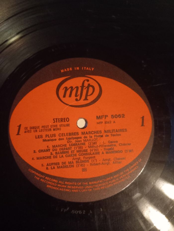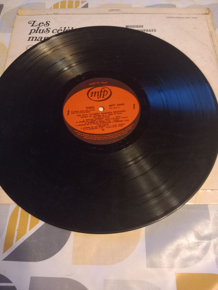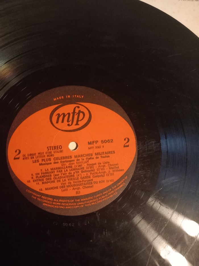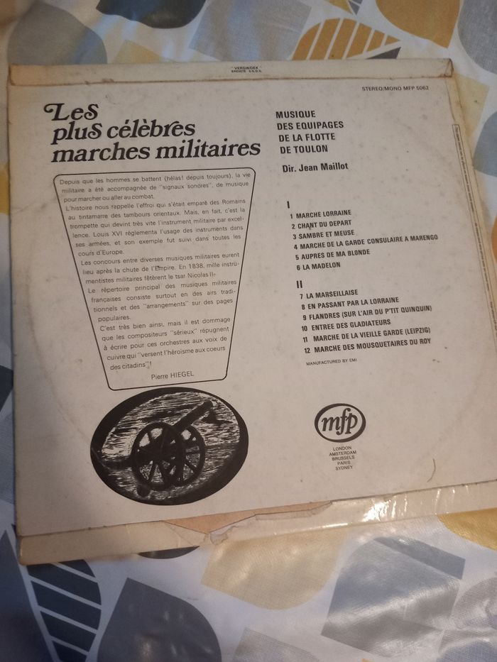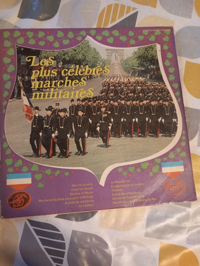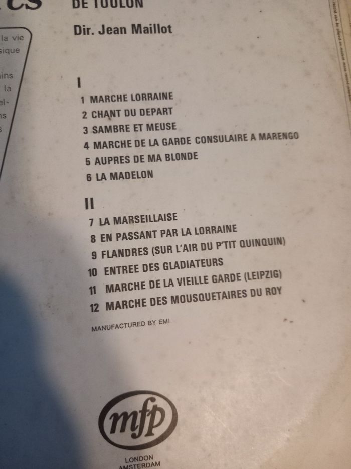 Disque vinyle 33 tours Artiste : musique des équipages de la flotte de Toulon Titre : les plus célèbres marches militaires Face A 6 titres Face B 6 titres En bon état