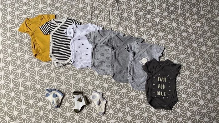 Lot de 7 bodies en coton fin et 3 paires de chaussettes en coton fin. Porté 2 fois.