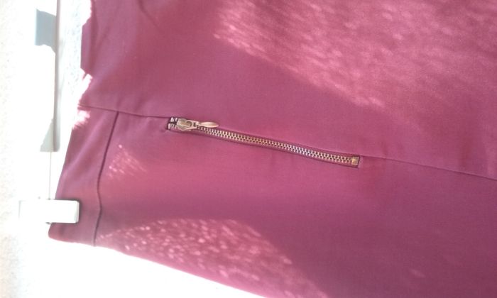 Fermeture zippée au dos, 2 zips sur le devant (sans poches), coloris bordeaux, H 45cm.