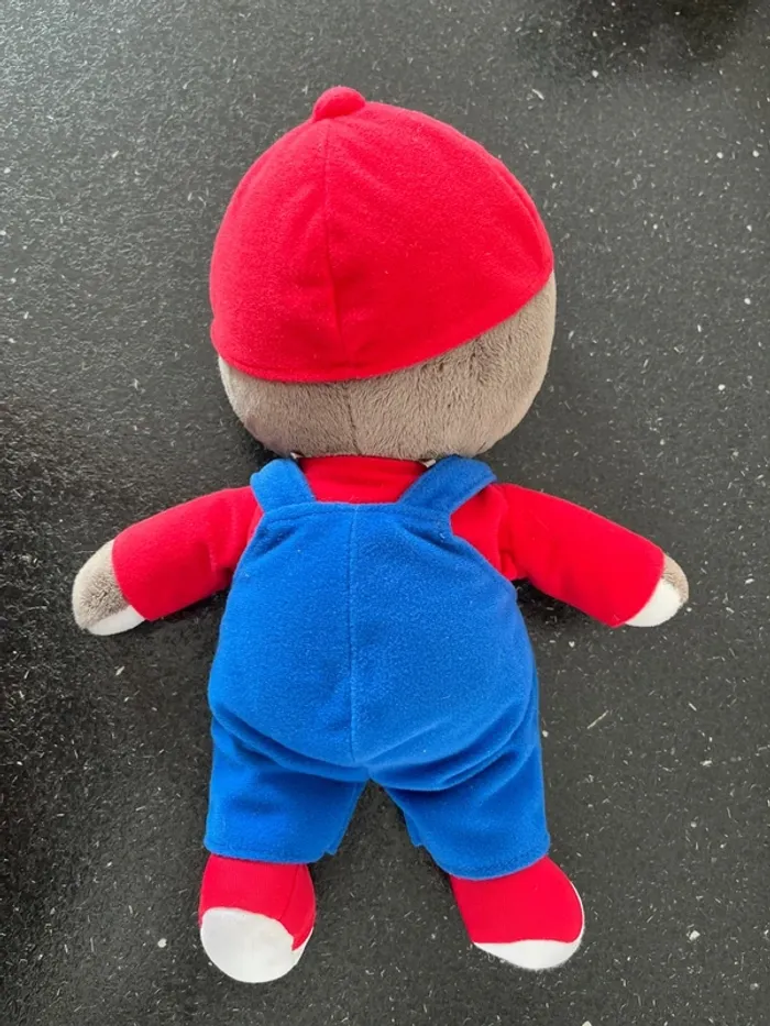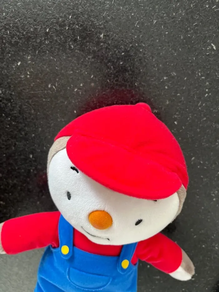 Belle mascotte pour la rentrée de septembre, école maternelle classe environ 30 cm de hauteur très propre, toute moelleuse, figurine T’choupi avec sa casquette rouge sa salopette bleue La salopette peut s’enlever, mais pas le polo Prix non négociable, merci