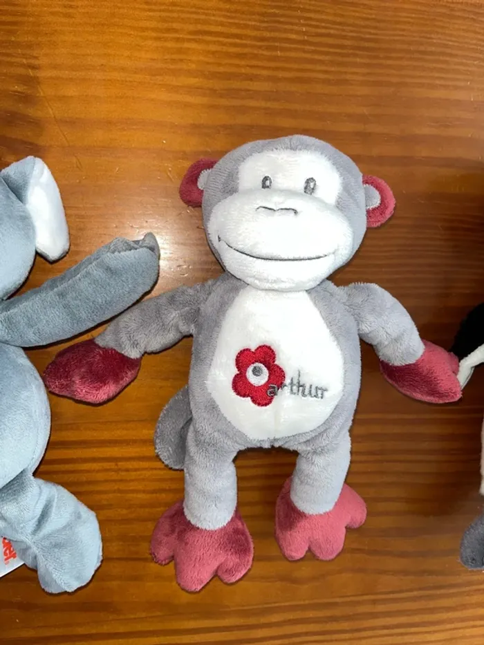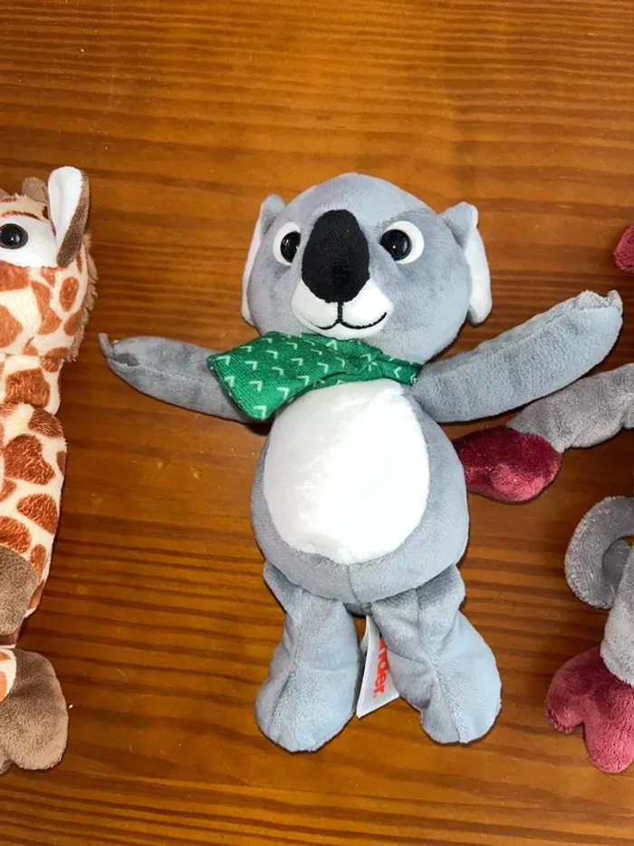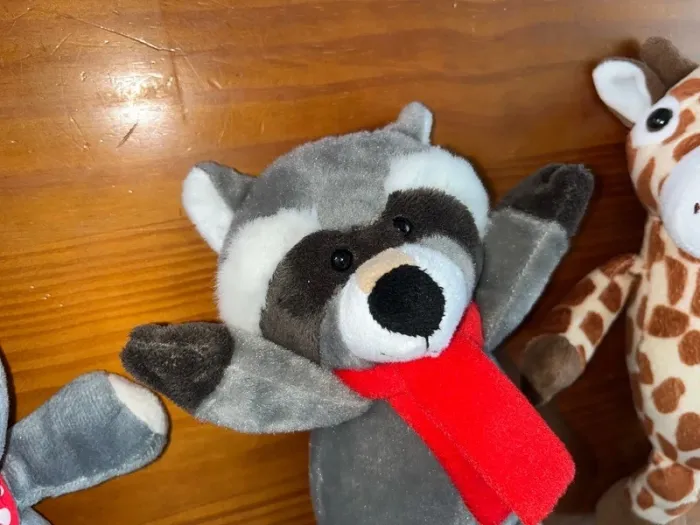 Mascotte, classe maternelle, école au choix, 10 euros, - un rhinocéros 🦏 gris bandana rouge pois blanc ou - une girafe 🦒 ou - Un raton laveur 🦝 cache nez rouge ou - un koala 🐨 cache-nez vert ou - un singe 🐒 gris Arthur (dispo en double exemplaire) Ou - un pingouin Nausicaa à 15 €
