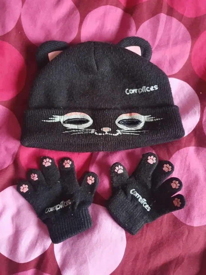 Ensemble bonnet et gants complices avec un chat en très bon état #ensemble #bonnet #gant #chat #complices