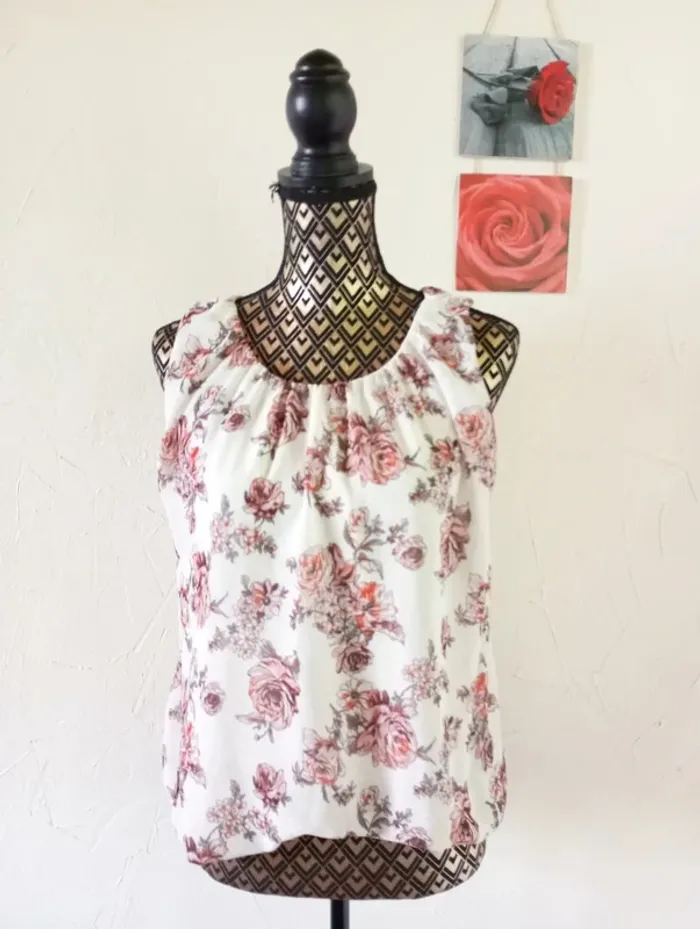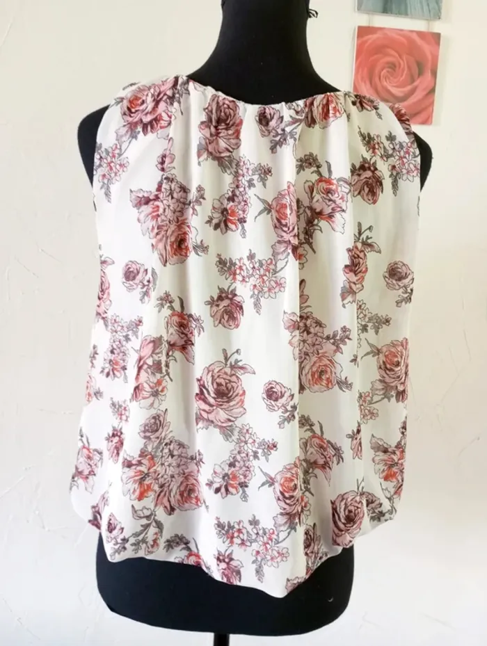 Jolie blouse sans manche, doublée, écrue et fleurie. Très bon état. Largeur à plat d'une aisselle à l'autre : 54cm, longueur depuis le dessus de l'épaule : 57cm environ. #frip_femme40 ⚠️lots : contactez-moi pour que je vous fasse une annonce spécifique si vous souhaitez faire un lot, une remise sera effectuée sur le total 😊😊