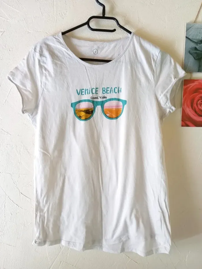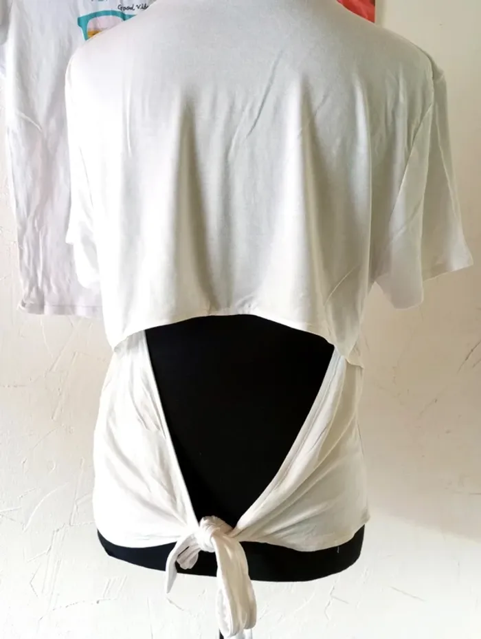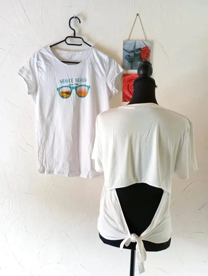 🌸1 t-shirt écru uni, simple devant mais ajouré dans le dos et qui se noue au niveau des reins, très bon état, Kiabi Largeur à plat d'une aisselle à l'autre : 50cm, longueur à partir du dessus de l'épaule : 53cm environ. 🌸1 t-shirt blanc avec déco Venice Beach devant, très bon état Largeur à plat d'une aisselle à l'autre : 46cm, longueur à partir du dessus de l'épaule : 61cm environ (un peu + long à l'arrière). #frip_femme40 ⚠️lots : contactez-moi pour que je vous fasse une annonce spécifique si vous souhaitez faire un lot, une remise sera effectuée sur le total 😊😊