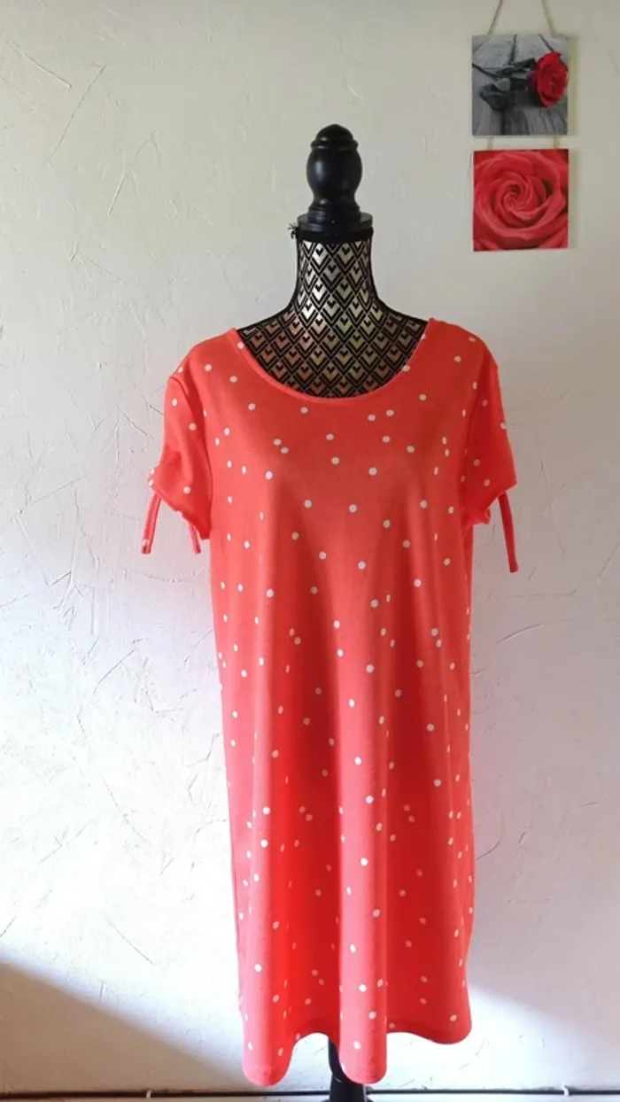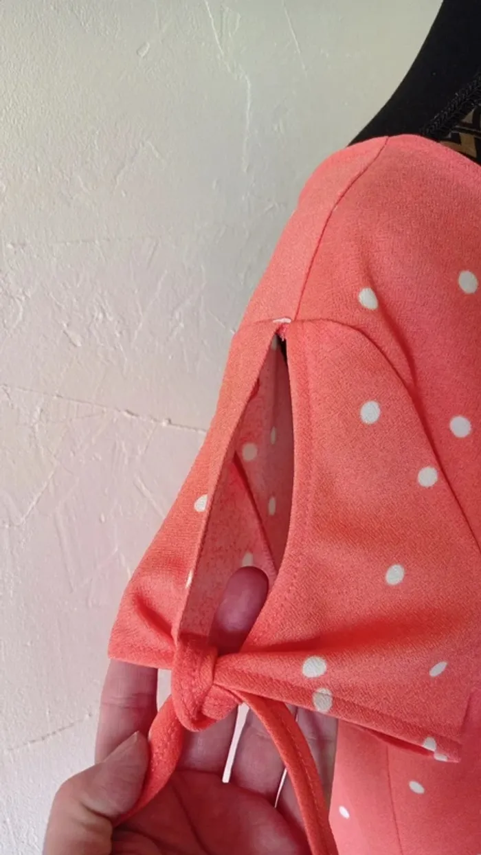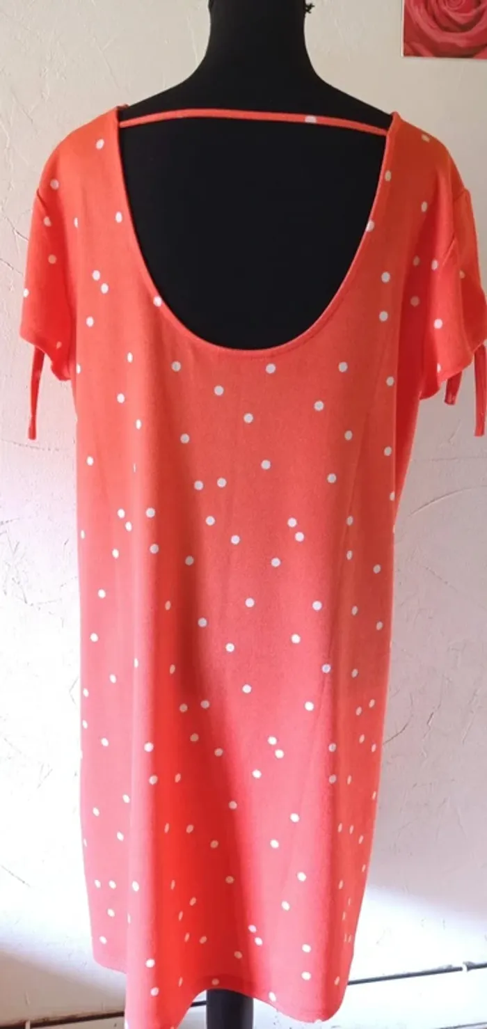Robe couleur corail à pois blancs, manches ouvertes avec petit lien à nouer (le lien est légèrement tâché sur une des manches, voir dernière photo). Dos très décolleté. Etiquettes manquantes mais correspondrait à un 46/48. Largeur à plat d'une aisselle à l'autre : 53cm, largeur à plat à la taille : 58cm, longueur depuis le dessus de l'épaule : 90cm environ. Matière extensible. Très bon état. #frip_femme46 #frip_femme48 ⚠️lots : contactez-moi pour que je vous fasse une annonce spécifique si vous souhaitez faire un lot, une remise sera effectuée sur le total 😊😊