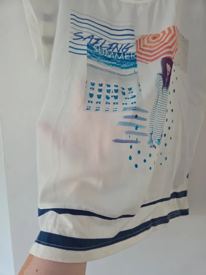Tee-shirt manche courte été femme blanc motifs marinière TBE taille M grain de malice