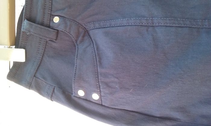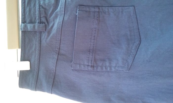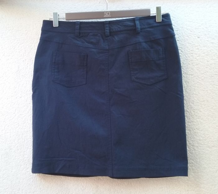Fermeture zippée et boutonnée, 4 poches, composée de 3% d'élasthanne, coloris marine, H 50,5cm.
