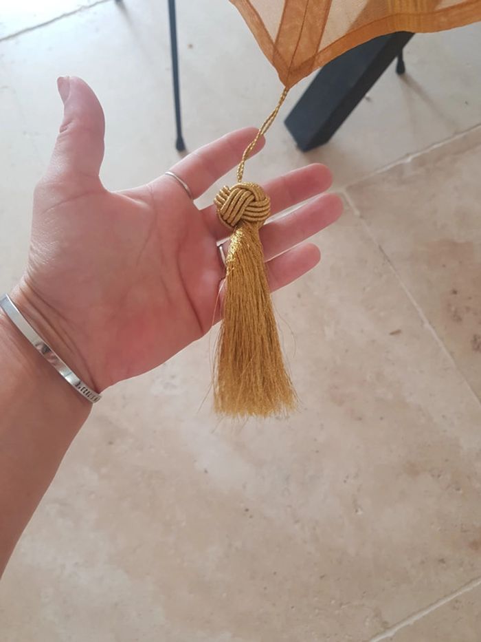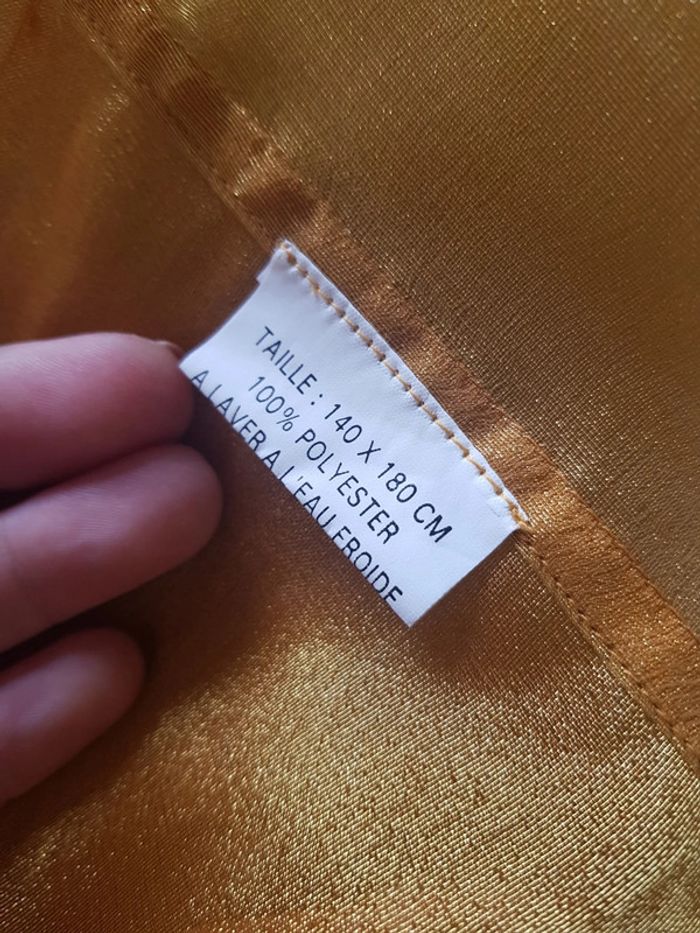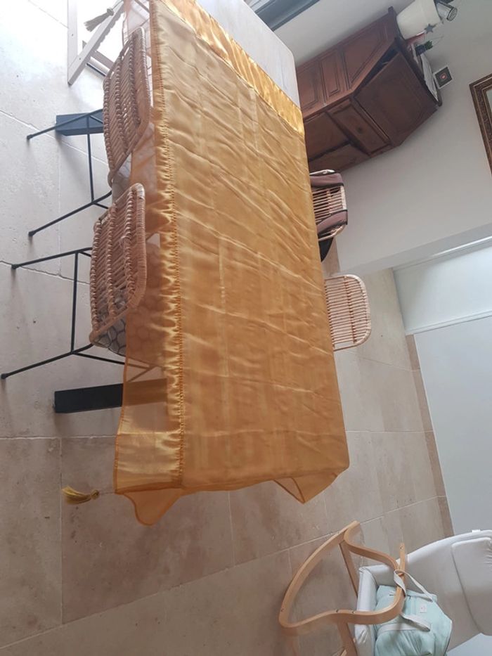 Nappe 140x180 neuve, trop courte pour ma table... En organza entre le moutarde et le doré, tres jonie avec 4 pompons