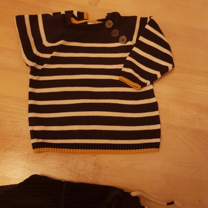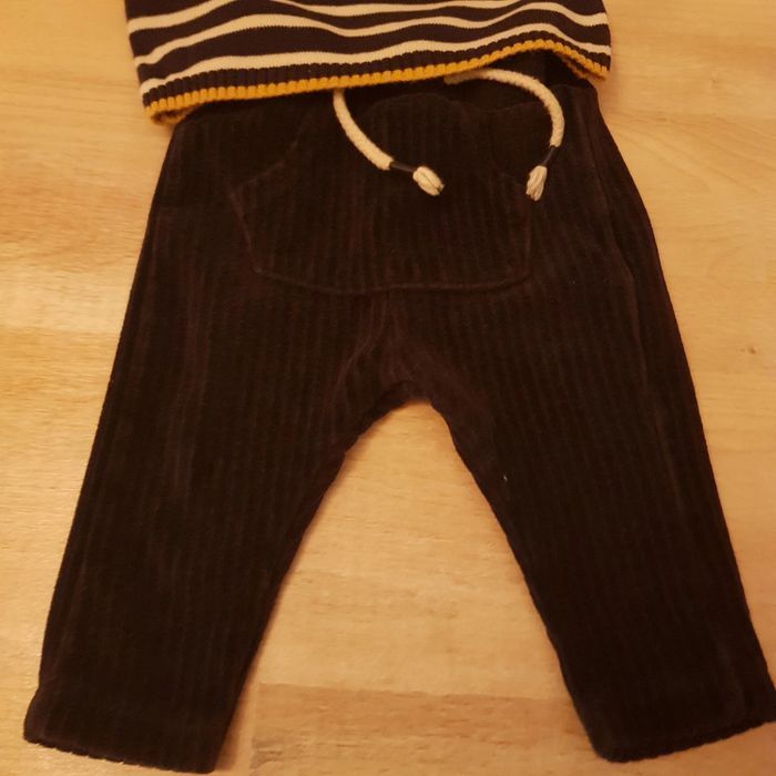Ensemble bébé garçon 3 mois trop craquant! Pantalon sarouel en velours côtelé bleu marine tout doux et pull style marinière avec bordures moutarde En excellent etat tres peu porté malheureusement j'adorais cet ensemble! Taille 3 mois marque Z Possibilité de faire des lots dans mon dressing pour bébé #bebehelio #bebehelio13mois