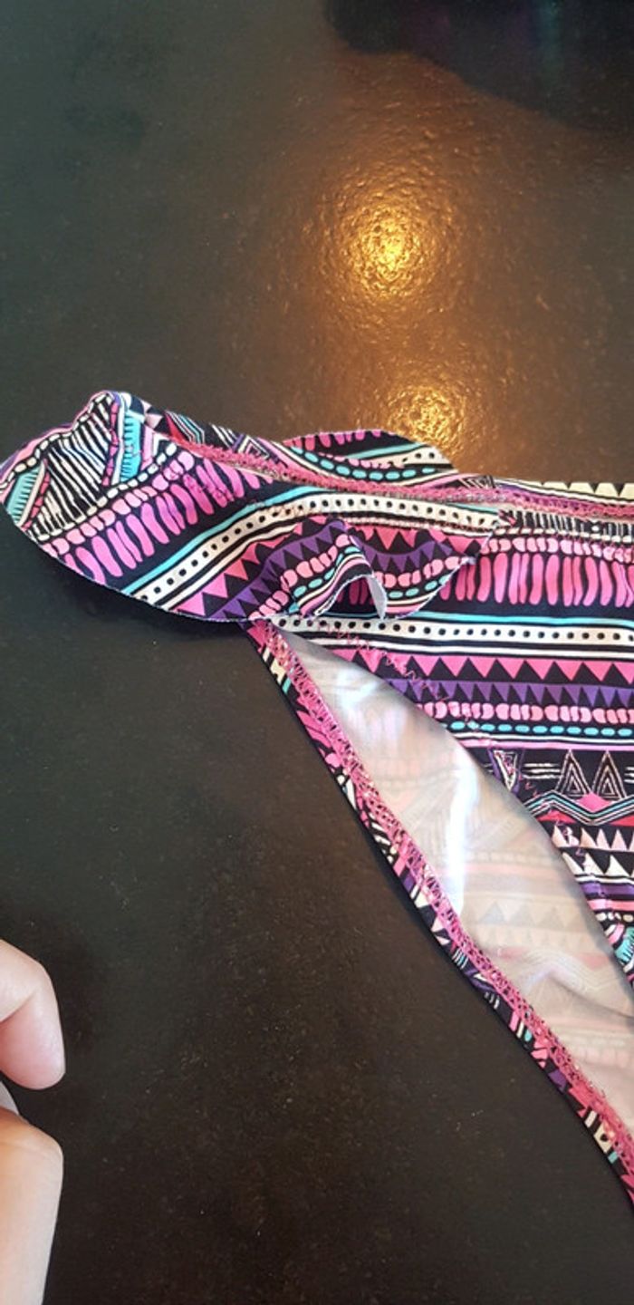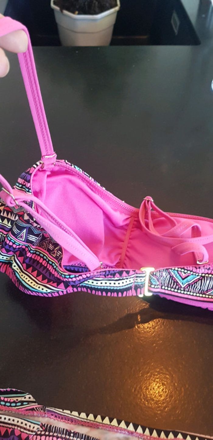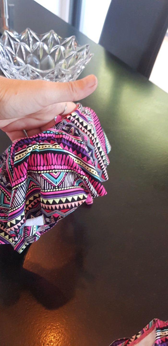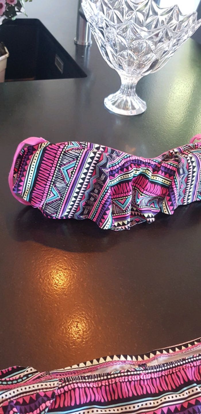 Maillot de bain 2 pièces dans les tons rons fluo et violet motif ikat Volant sur le bandeau, details volants sur la culotte Bretelles amovibles Bon etat