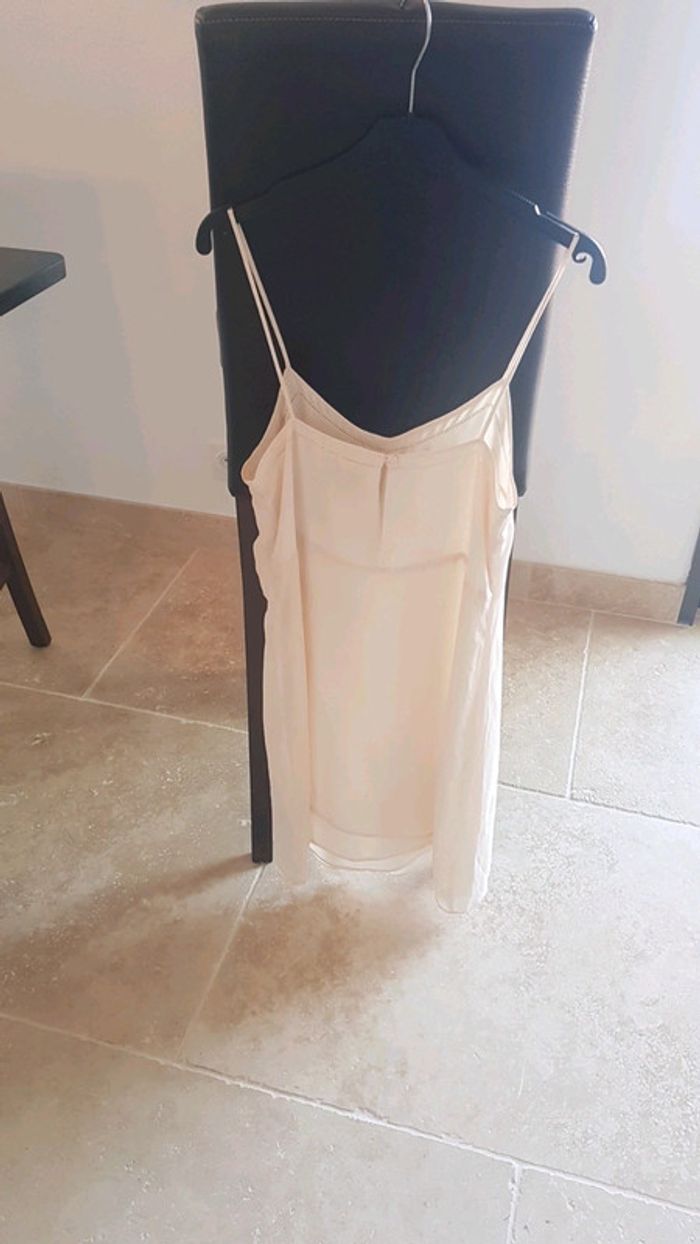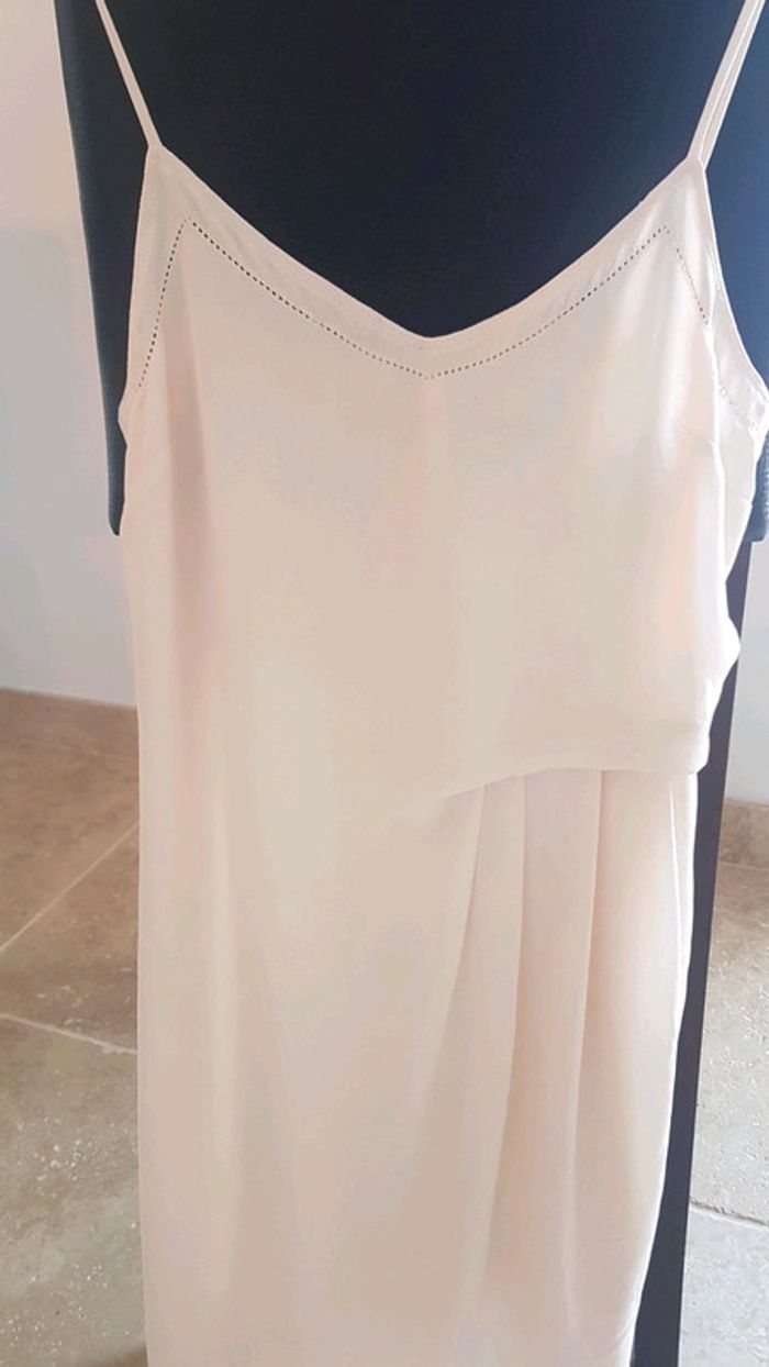 Robe beige en voile beige doublée Détail froncé sous la poitrine gauche Bas asymétrique à l'arrière Taille 36