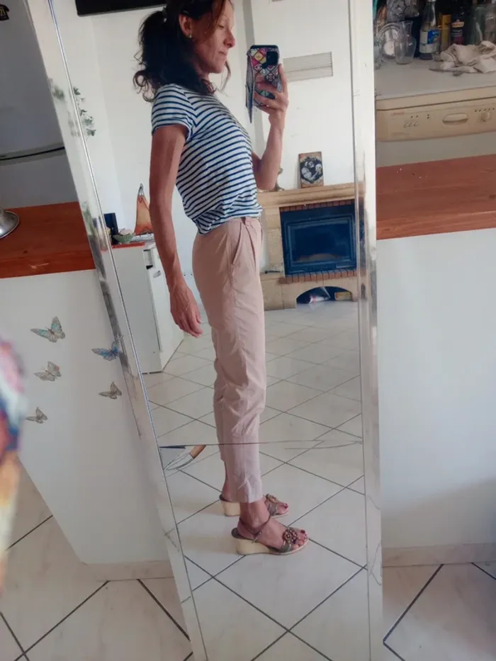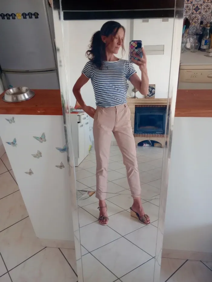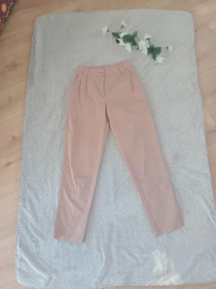 Aspect neuf ❤️ Joli pantalon type pince avec deux poches au niveau de la taille Classe sans trop l'être 😘 Peut-être porter aussi bien avec des sneakers blanches qu'avec des chaussures à talon Une fausse poche à l'arrière Longueur 94 largeur 30 cm Trop serré pour moi 😅 #carineleray_femme_32