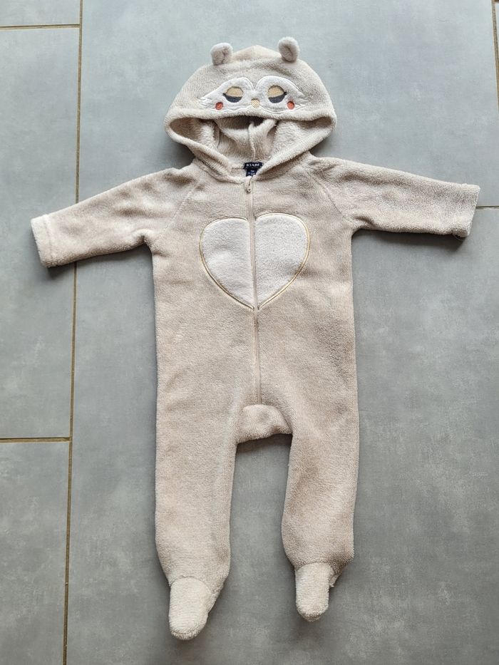 Combinaison à capuche, de couleur crème, toute douce, avec capuche, de la marque Kiabi, taille 9 mois (69-72 cm), en très bon état. Article lavé pour la vente.