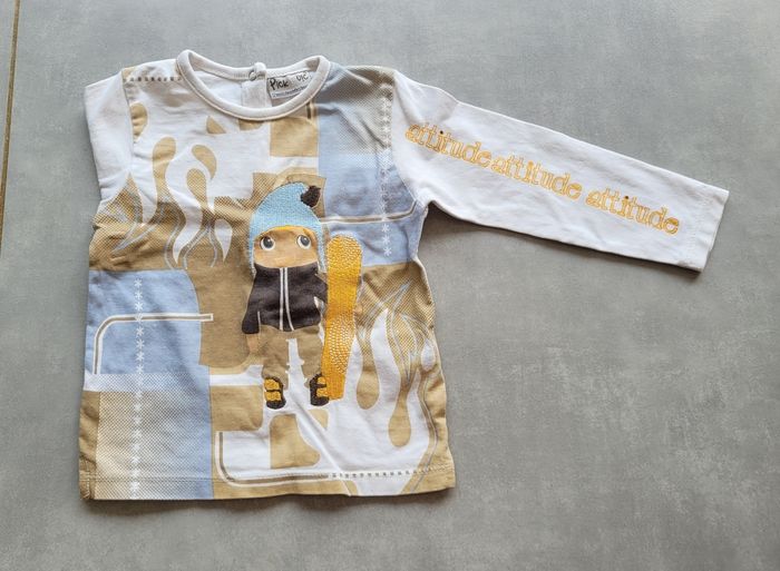 T-shirt manches longues, de couleur blanc avec motif, de la marque Pick Ouic, taille 12 mois, en très bon état. Article lavé pour la vente.
