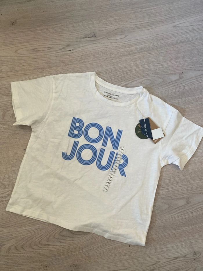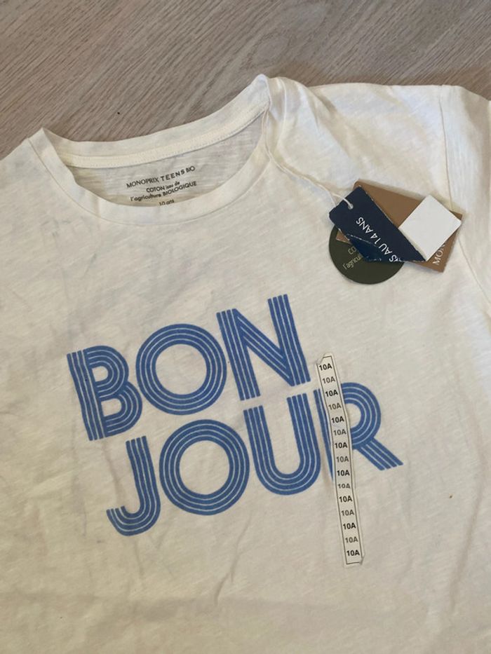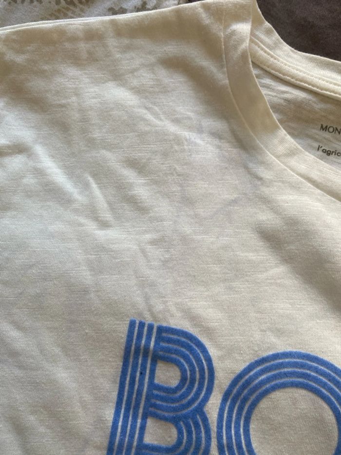 T-shirt Monoprix coton, issu de l’agriculture biologique. Taille 10 ans neuf Il y a quelques petites traces, très légère bleue, je pense que c’est le bon qui a laissé sa trace