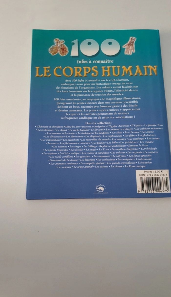 Je vends ce livre "100 infos sur le corps humain" destiné aux jeunes et adolescents. - Titre : 100 infos sur le corps humain - Genre : Livre jeunesse - Éditeur : Piccolia - Format : Broché - Langue : Français Très bon état sauf 1 page qui a été découpée, voir photo N'hésitez pas à me contacter pour plus d'informations !