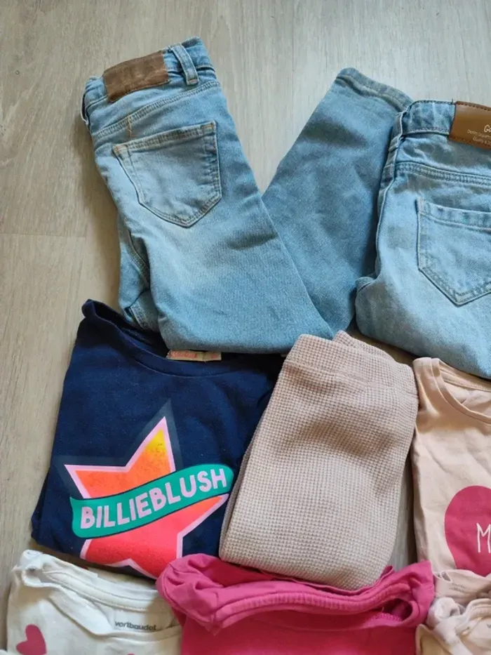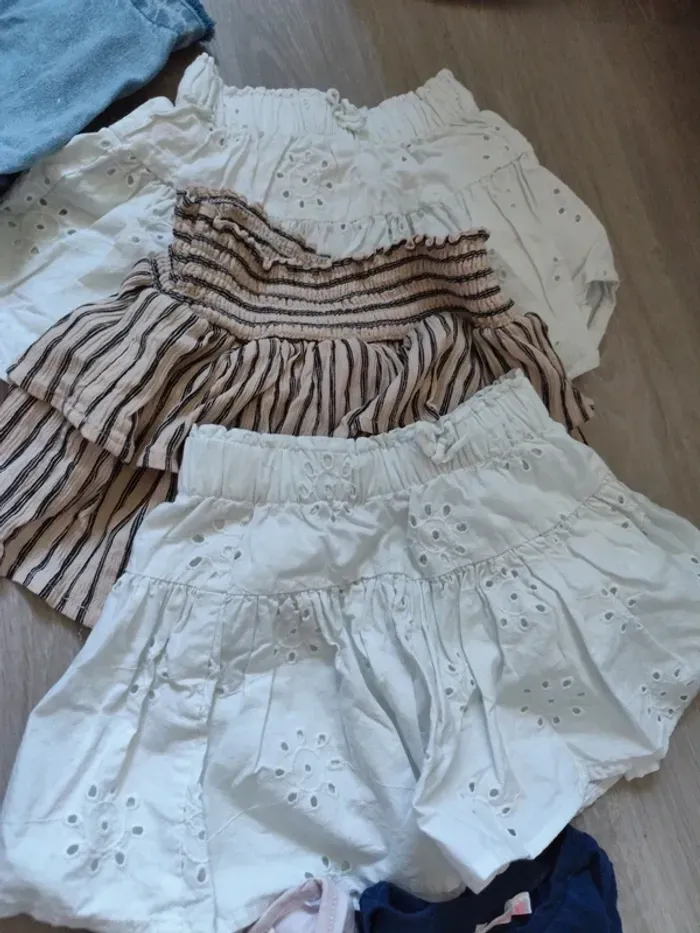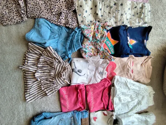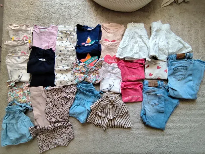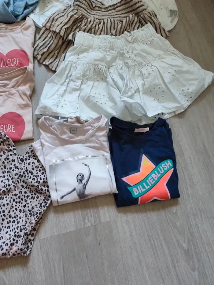 Deux jeans en très bon état,3 leggings,6 t-shirt manches courtes, 6 t-shirt manches longues ,5 jupes courtes, 4 top manches courtes ou bretelles, deux shorts blanc fleur portés une fois seulement chacun.