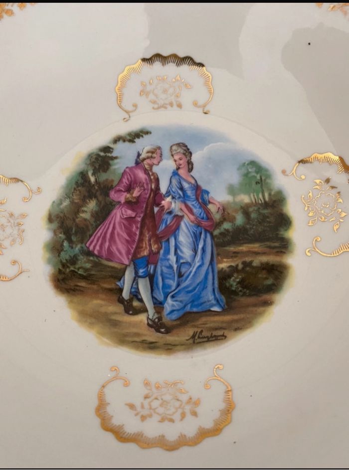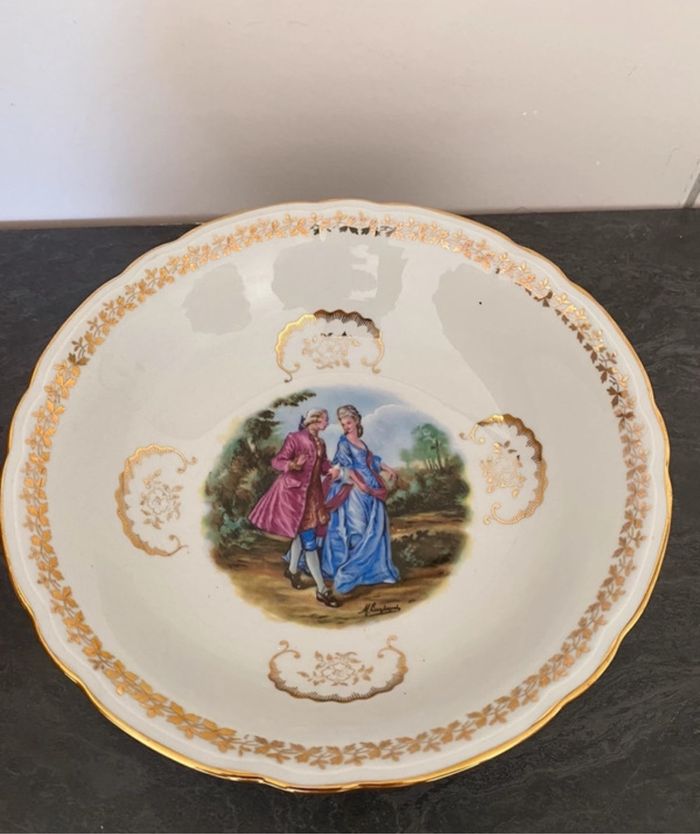 🍽️ Saladier en porcelaine de collection – Berry Haute Porcelaine 🏺 Matière : Haute porcelaine de qualité 📏 Diamètre : 23,5 cm ✨ Finition : Dorure élégante sur les bords 🎨 Décor : Scène romantique peinte avec détails soignés 📚 Collection : Berry Haute Porcelaine 🪞 Pièce idéale pour décoration, collection ou service raffiné. 📦 Très bon état.