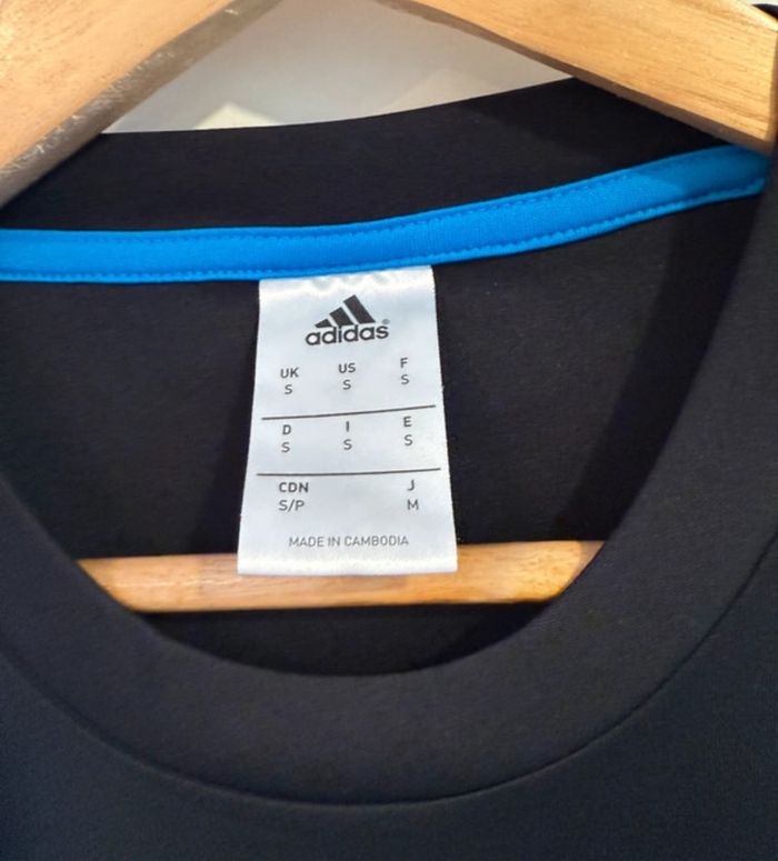 👕Taille : S 🧼 Très bon état - peu porté 📍 Marque Adidas, logo sur la poitrine 👕 Couleur : noir avec bandes Adidas blanches et bandes bleu 💯 Authentique et confortable, idéal pour un look sport et décontracté