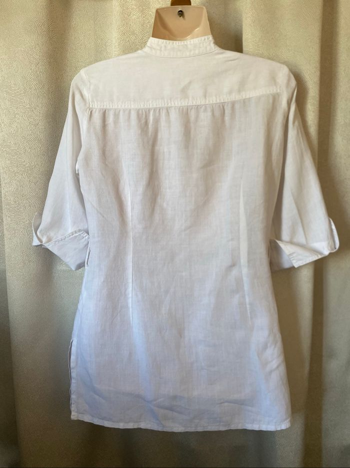 Jolie veste chemise 100% lin blanc Taille 40 Caroll Les manches sont longueur 3/4 avec revers 2 poches avec revers sur la poitrine Plus de ceinture Carrure 37 cm Aisselle à aisselle 50 cm Longueur dessous de manche revers défait 30,5 cm, 23 cm avec le revers Largeur à plat à la taille 41,5 cm Longueur 74,5 cm