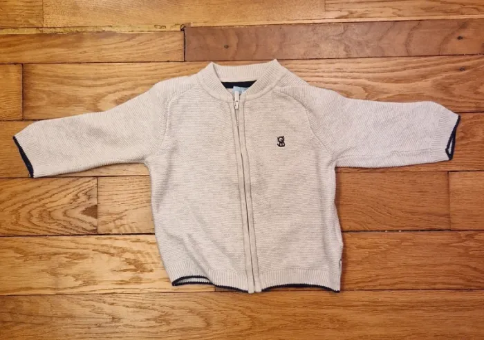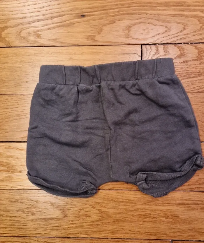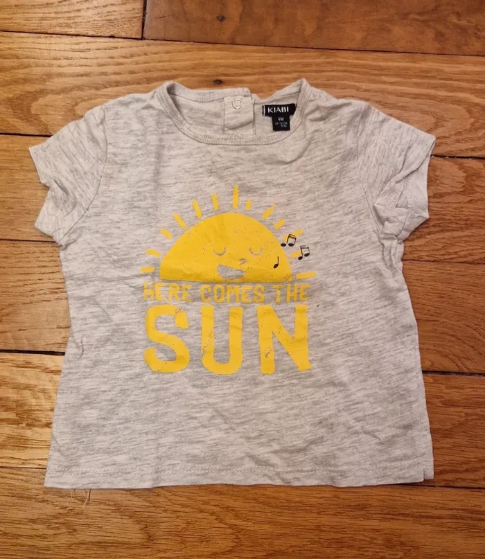 Lot de vêtements bébé 9 mois, comprenant : - 1 tshirt soleil, Kiabi - 1 gilet gris clair, Obaibi - 1 short gris foncé, Kiabi - 1 T-shirt blanc, Lemon Peret