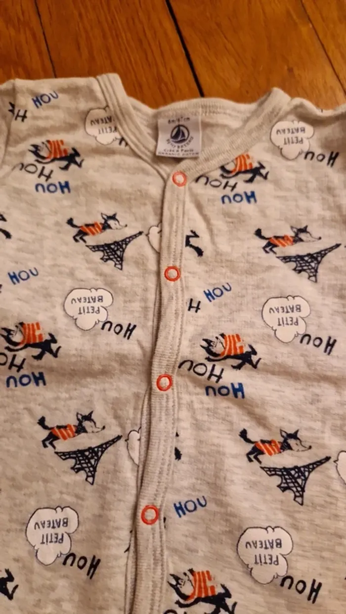 Pyjama 1 pièce, qui s'attache par pression sur le devant. Très bon état. Marque Petit Bateau. Taille 6 mois (67 cm) Motifs Tour Eiffel et petits loups.