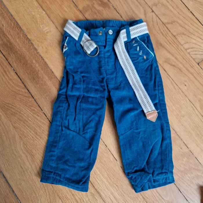 Ensemble comprenant un pantalon en velours côtelé bleu et un t-shirt manches longues intégrant un body, assorti. Très bon état. Sergent major, taille 18 mois