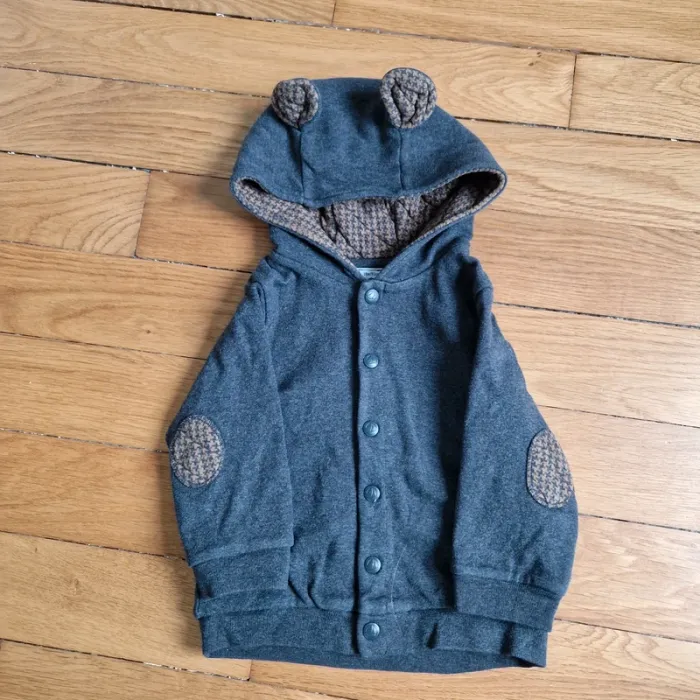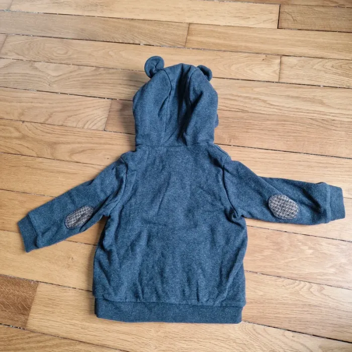 Sweat gris à capuche avec petites oreilles. Très bon état. Marque Petit Bateau. Taille 18 mois