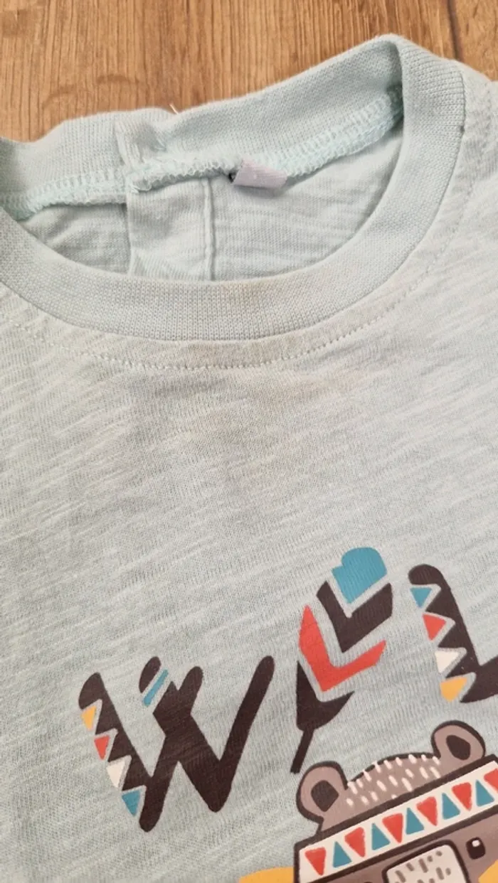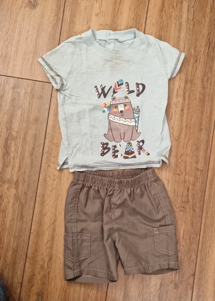 Ensemble bébé comprenant un short kaki et un T-shirt vert amande. Le t-shirt est légèrement taché au col (voir photo) mais le reste est nickel