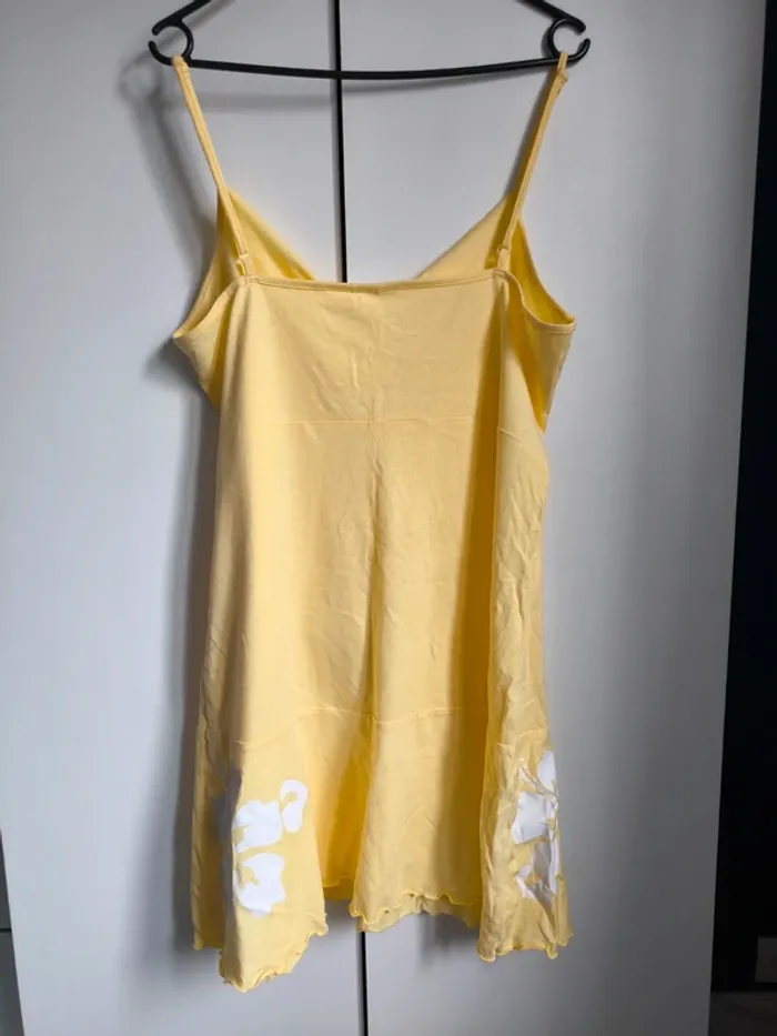 Robe d'été jaune avec fleurs jaune et blanche. Bretelles réglables.