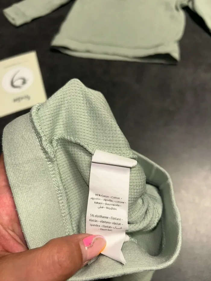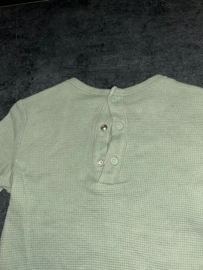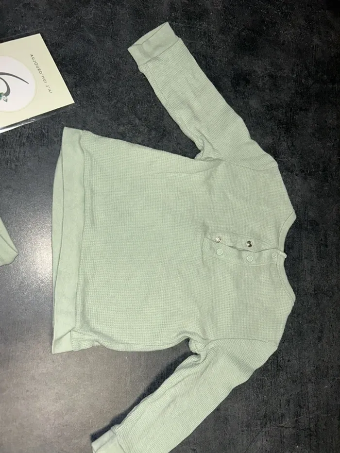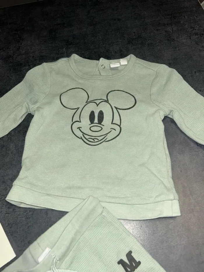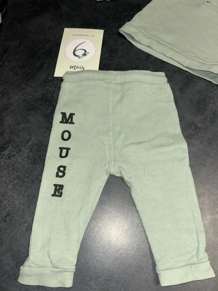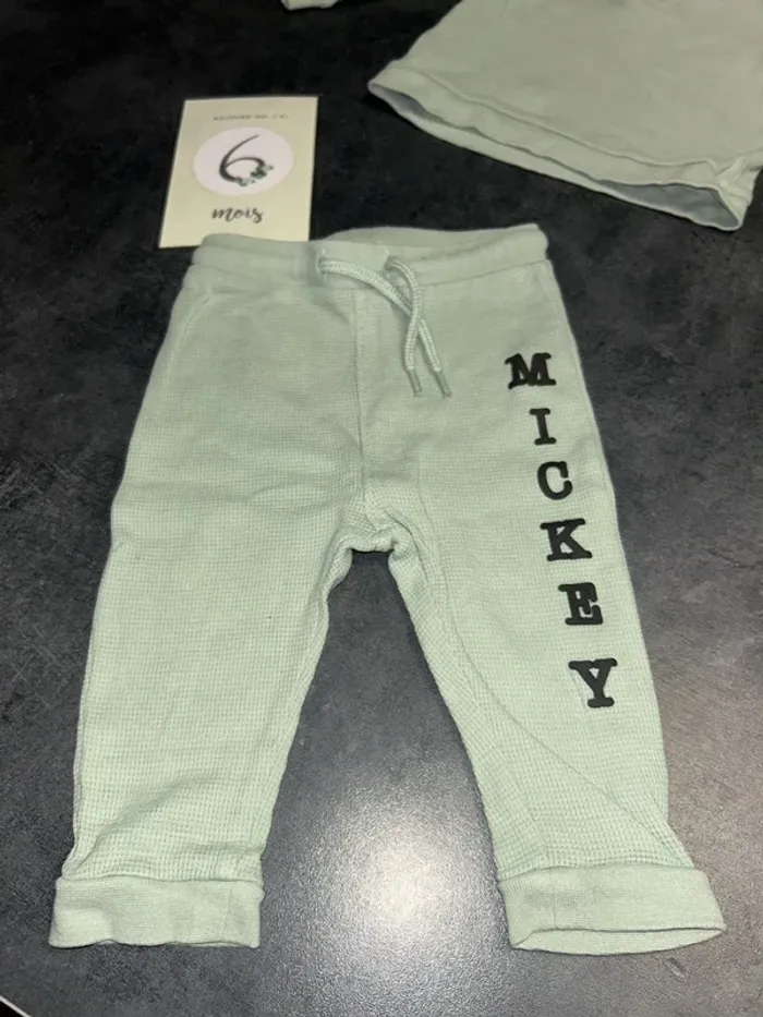 Ensemble bebe pull + pantalon Pull : vert d’eau avec pression a la nuque et tête de Mickey Pantalon : vert d’eau avec ficelle à la taille et inscription « MICKEY MOUSE » Taille : 6 mois/ 67 cm