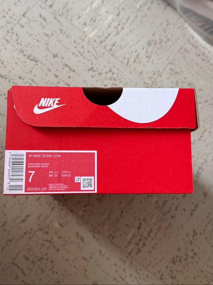Nike Dunk Low Rose Whisper Couleur : blanc et rose poudré, un modèle tendance et indémodable. Porté 2-3fois, en très bon état (voir photos), semelles et tige impeccables. Aucune tâche, déchirure ou odeur juste légère pliure sur devant de la basket Détails • Marque : Nike • Modèle : Dunk Low Rose Whisper • Taille : 38 EU • État : Très bon état • Boîte d’origine : incluse