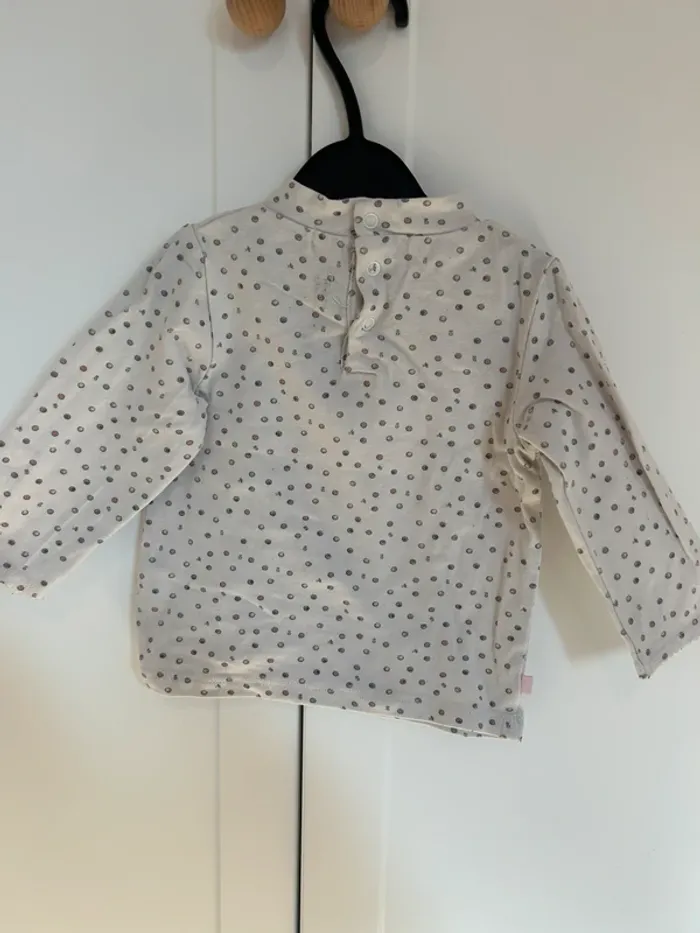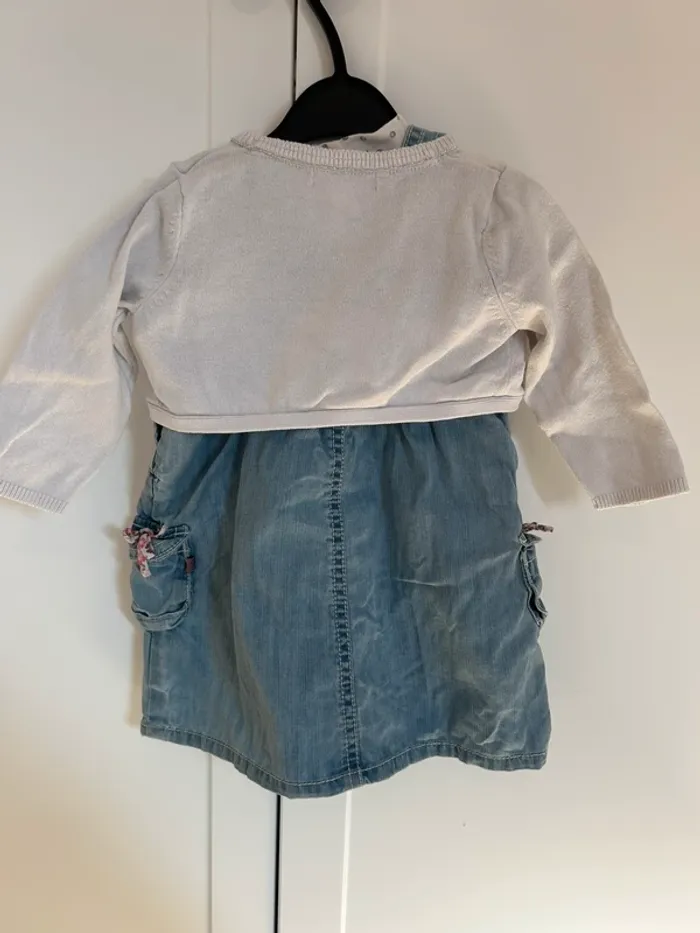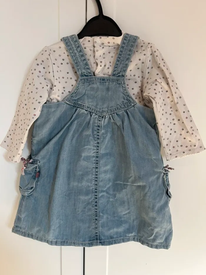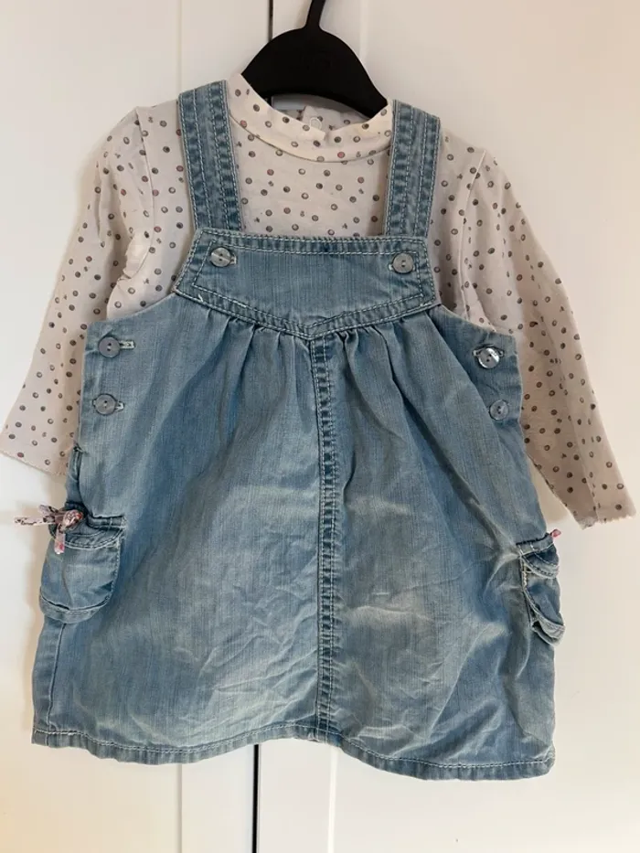 Gilet blanc, tee shirt manche longue à pois et robe en jean #claumalo6mois