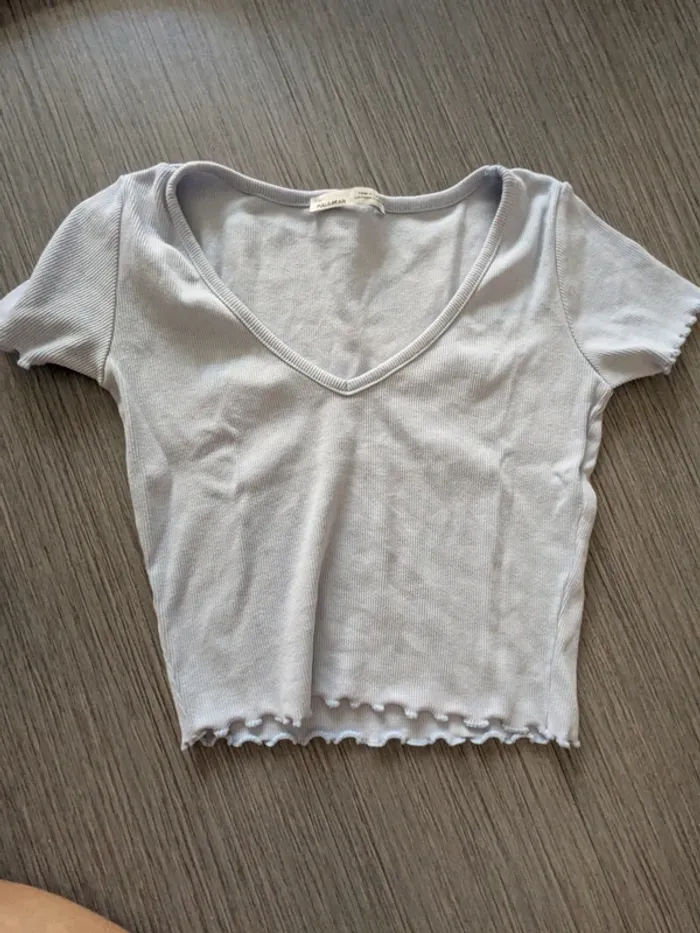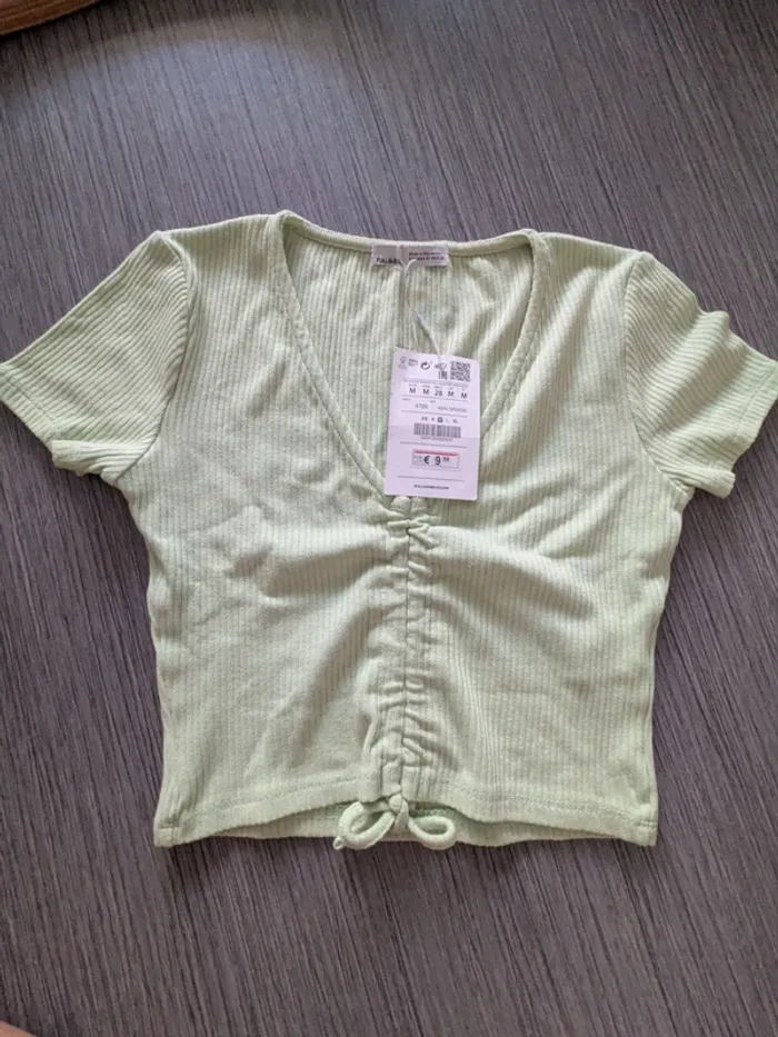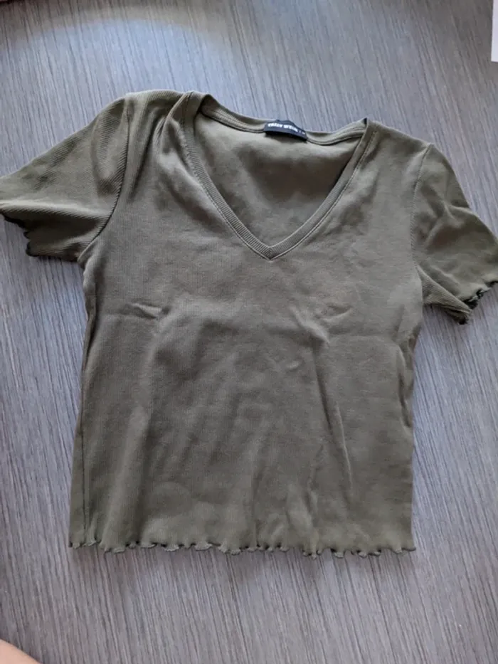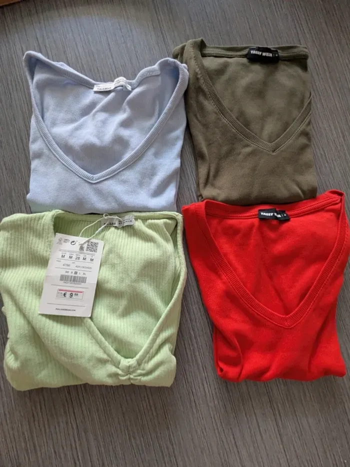 Lot de 4 t-shirts courts, taille M, en coton. 2 Tally weijl + 2 pull & bear. Il y a un article neuf avec étiquette, les trois autres sont en excellent état. Couleur rouge, kaki, lilas et vert clair.