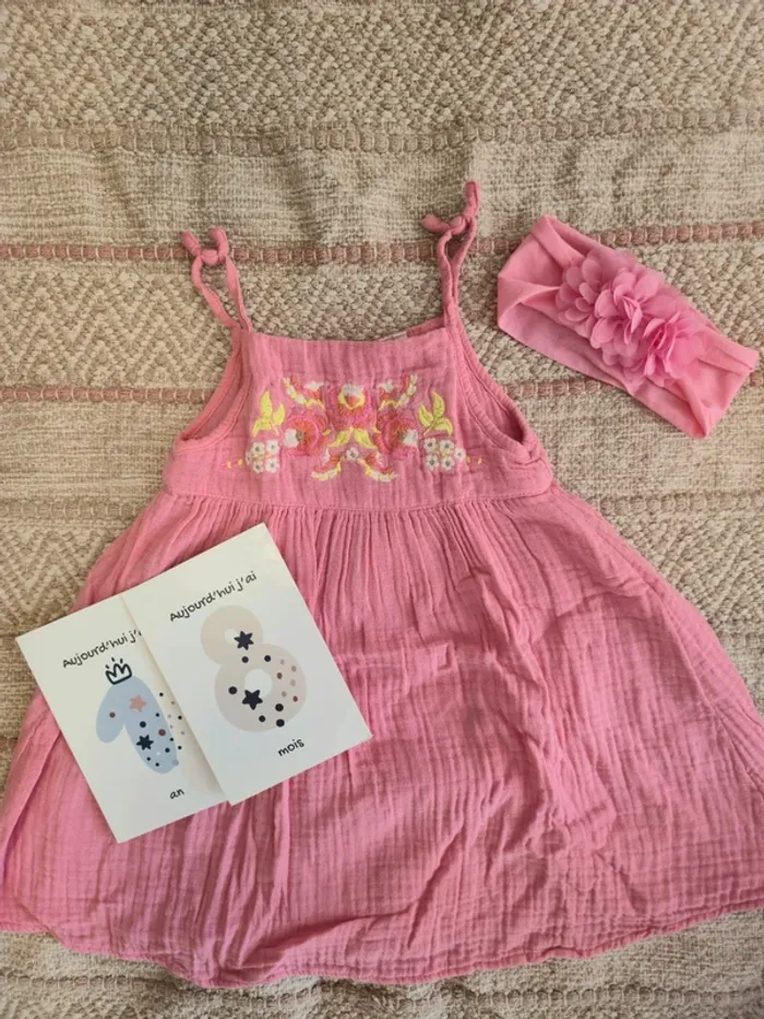 Robe rose avec de très jolies broderies et son bandeau assorti. Marque : Orchestra Taille : 18 mois Pour voir mes autres vêtements en 18 mois ⏩️ #18moiscyse ✅️ Mon dressing est trié, n'hésitez pas à aller voir sur mon profil. 📪 Envoi par Mondial Relais svp, merci. 👗 D'autres vêtements femme XS à M, chaussures 39 et 40 et accessoires. 👶🏼 Vêtements bébé/enfants de 3 à 36 mois, chaussures et accessoires 🧸 Jouets 📚 Livres