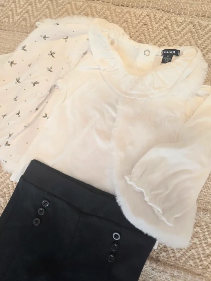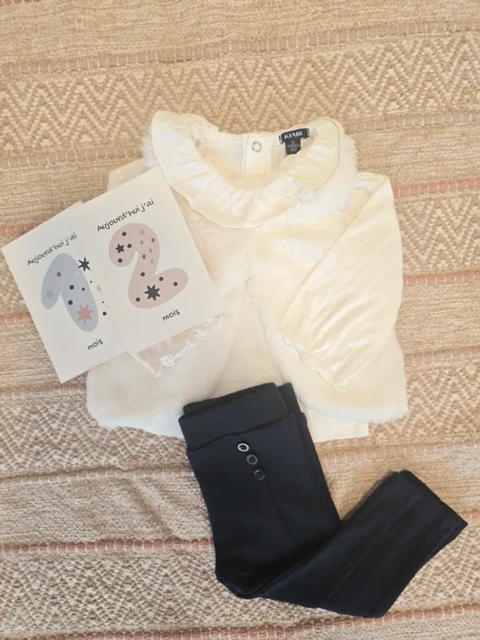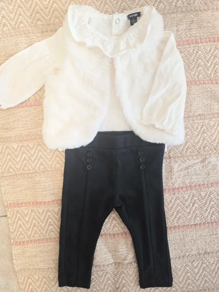 Ensemble 3 pièces composé d'un haut blanc manches longues avec col à volant, un legging bleu marine et un gilet sans manches nounours façon "pilou-pilou".