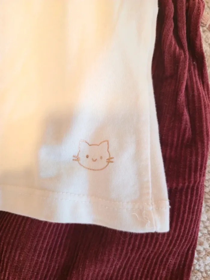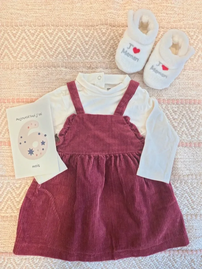 Ensemble composé d'un sous-pull avec détail "chat", neuf, d'une robe bordeaux et de petits chaussons.