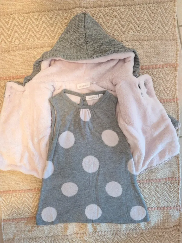 Ensemble rose et gris composé d'une robe-pull à pois et d'une veste fourrée "pilou-pilou". Idéal pour garder bébé au chaud. Marque : Noukie's Taille : 6 mois Pour voir mes autres vêtements en 6 mois ⏩️ #6moiscyse ✅️ Mon dressing est trié, n'hésitez pas à aller voir sur mon profil. 📪 Envoi par Mondial Relais svp, merci. 👗 D'autres vêtements femme XS à M, chaussures 39 et 40 et accessoires. 👶🏼 Vêtements bébé/enfants de 3 à 36 mois, chaussures et accessoires 🧸 Jouets 📚 Livres